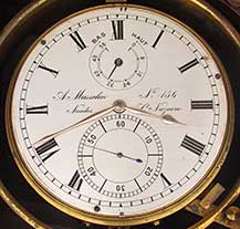 13.07 AMERICAN CHRONOMETER. Excellent turn-of-the-1900’s ship’s 2-day navigational timekeeper with the dial engraved in fancy cursive script “Thos G. Medinger.” Then in Gothic script “New York No. 1001.” This especially handsome chronometer has a silvered brass dial with bold Roman numerals a minute chapter ring swept by solid gold spade hands. The large seconds bit covers the VI which shows single seconds marked by 10’s. At the top of the dial, below the XII, is the Up/Down indicator running from 0 - 56 in 8 hour increments. The dial is complete with its silvered reflector ring covered by the knurled brass bezel with beveled glass crystal. It is set in its heavy turned brass bowl with rotating dust cover on the bottom for winding. The all brass movement is the finest quality of its time, being made by the famous award winning maker Victor Kullberg. It has damascened brass plates, beautiful blued steel screws, large balance with temperature compensation, diamond end stone, spring détente escapement, and of course Kullberg’s signature reverse chain-drive fusee. The bottom of the bowl is stamped with Kullberg’s number 8478 which dates to 1911. The chronometer and bowl are slung in gimbals in their classic brass bound solid mahogany box. In our experience, the overall presentation is particularly handsome. The box itself is in near pristine original condition after more than 100 years! In addition, it retains 3 more valuable features. The front bears the engraved ivory label reading “THOS. MEDINGER 1001 NEW YORK.” Then in the lid is the trade label of “Eugene F. Medinger, New York.” And the middle tier bears the label of the famous American nautical company “John Bliss & Co., New York.” The sides of the box have inlaid folding brass handles. It is complete with its original ratcheted winding key and rarely found original box lock skeleton key. The bezel measures 4 7/8 inches in diameter. The box is 7 ¼ inches square by 7 ¾ inches high. Condition is just about as nice as any we have seen in our 40+ years of doing this business. A real winner! Price Request Victor Kullberg (1824-1890). According to Mercer in “Chronometer Makers of the World, “ His workmanship was without doubt of the highest quality. He supplied many retailers and nautical opticians with complete movements.” Kullberg was awarded medals at Sydney, Paris, Le Harve, Philadelphia, London and Scotland, including 9 gold medals, the Cross of Legion of Honour in Vienna and the Grand Prix in Paris. Kullberg chronometers finished first in the annual Greenwich Observatory trials an amazing 24 times beginning in 1864 through 1914 when the trials were ended. Kullberg 8472 took the prize in 1913. |