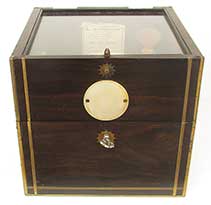 13.85 WINNING CHRONOMETER. Second quarter of the 1800's two day marine chronometer by the very famous London makers "Robert Molyneaux & Sons No. 1558, LONDON " as beautifully engraved in cursive script on the silvered brass dial. This handsome navigational timekeeper is the early 2-day type with Up/Down indicator reading from 0 (Up) to 54 (Down). It has bold Roman numerals and a minute chapter swept by lovely solid gold spade hands. A large subsidiary seconds bit is just above the VI. It indicates single seconds marked by 10's. The prefect dial is protected by the classic domed glass crystal with thin knurled brass bezel. The early movement is a thing of beauty having a bi-metallic balance with large segmental pie-shaped weights, blue steel helical hairspring, diamond end stone, blued steel screws, spring détente escapement and of course a chain-drive fusee. It is slung in its solid brass tub mounted in gimbals, with thumbscrew locking lever in the front right of the box. The handsome 3-tier box of crotch grain African mahogany is of simple form, indicative of its early manufacture. It has an inlaid ebony dust combing in the bottom tier and is complete with its early form ratcheted "butterfly" winding key. The front bears a large blank ivory nameplate and starburst inlays around the key escutcheon and button latch. The top lid is inlaid with a classic brass shield. The sides have inlaid flush folding brass carrying handles. This chronometer measures exactly 4 ½ inches in diameter. Its box measures 7 3/8 inches wide and 7 1/8 inches deep by 7 7/8 inches high. Outstanding original condition is all respects. The chronometer is a strong runner and keeps good time. Circa 1833. Price Request |