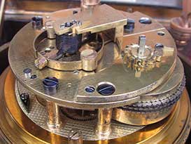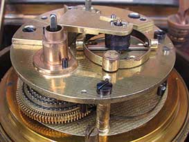 13.19/19.94 YACHT CLOCK. Especially nice 19th century yacht salon clock with the silvered brass dial engraved “BENZIE COWES” underneath the winding arbor. The lovely dial has bold Roman numerals and a minute chapter ring swept by blued steel spade hands. Around the center arbor the dial is decorated with hand-engraved floral motifs. The Fast/Slow adjustment it made within the XII. The all brass clock mechanism is most unusual. It consists of a plain balance wheel with coiled hairspring with a lever escapement. But what is remarkable different from most such escapements is that the escape pallet is mounted on a long rod passing through the back plate and is in line with the motion work wheels below. The Fast/Slow adjustment is also very unusual, being another long rod passing from the dials to a lever on the balance cock above the jeweled top pivot. It is marked F / S.” The back plate is marked within an oval “V.A.P. BREVETÉ S.C.D.G.” Complete with period winding key. This is a splendid example of traditional Victorian melding of form and function in that era, prone to extravagance. This clock was not only a handsome addition to the elaborate décor of the yacht’s salon, it provided a valuable real time reference. 649 Simpson Benzie was listed as a clockmaker working in West Cowes, Isle of Wight, England form 1867-1878. (Brian Loomes, “Watchmakers & Clockmakers of the World, Volume 2,” 1978, N.A.G. Press, London). Cowes has been seen as the home for international yacht racing since the founding of the Royal Yacht Squadron in 1815. It is perhaps best known for the running of the first “All Nations Cup” held on August 22, 1851 around the Isle of Wight off Southampton and Portsmouth in a fleet race between the New York Yacht Club’s AMERICA and 15 yachts of the Royal Yacht Squadron. The race, witnessed by Queen Victoria, was won handily by the schooner yacht AMERICA. It is now considered to be the first “America's Cup” race, the most prestigious perpetual international yacht race in the world.. |
