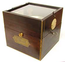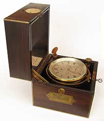 13.60 EARLY 8-DAY CHRONOMETER by FAMOUS MAKER. Without question, one of the finest chronometers offered for sale in the world today. This impressive marine timekeeper was made by “A. Johannsen 147 Minories London” as beautifully engraved in fancy script. The large silvered brass dial has bold Roman numerals and a minute chapter. The oversized subsidiary seconds bit is over the VI indicating single seconds marked by 10’s. Within, it bears the mark “No. 1040.” At the top, under the XII, the ~UP~ DOWN winding indicator is marked 0 to 8 and reads “WIND” at the 7 sector. The dial is swept by magnificent solid gold spade hands. The circumference has a silvered reflector ring protected by a thick beveled glass crystal. It is set in a knurled brass bezel. Unscrewing the bezel reveals the massive movement within. It has decoratively engine-turned plates, a large bi-metallic balance with timing weights, blued steel helical hairspring, diamond end stone, spring détente escapement, and of course a chain drive fusee. Interestingly the balance is protected by a crescent-shaped shield which would prevent this delicate and complicated piece of machinery from being damaged should the chain let go. The movement is housed in its beautiful bright brass bowl slung in gimbals and mounted within its large brass-bound solid rosewood box. The bottom of the bowl contains a spring-loaded winding dust cover. The classic oversized 3-tier box contains the pivoting gimbal lock on the right front and the original ratcheted chronometer winding key on the rear bottom tier. It is complete with brass skeleton lock and inlaid ivory number disc engraved with the matching serial number “1040.” The middle tier is glazed on top and bears the inlaid ivory marker’s disc on the front engraved “A. Johannsen LONDON.” A star burst escutcheon encircles a button latch which engages the solid rosewood lid with brass inlay. Both upper tiers are fitted with lid stops. The sides of the lower box have stout folding brass drop handles for carrying. The chronometer itself measures 5 ¾ inches in diameter. The box is 8 by 8 inches and is 8 ½ inches tall. Excellent original condition throughout and an excellent timekeeper. SOLD |