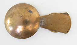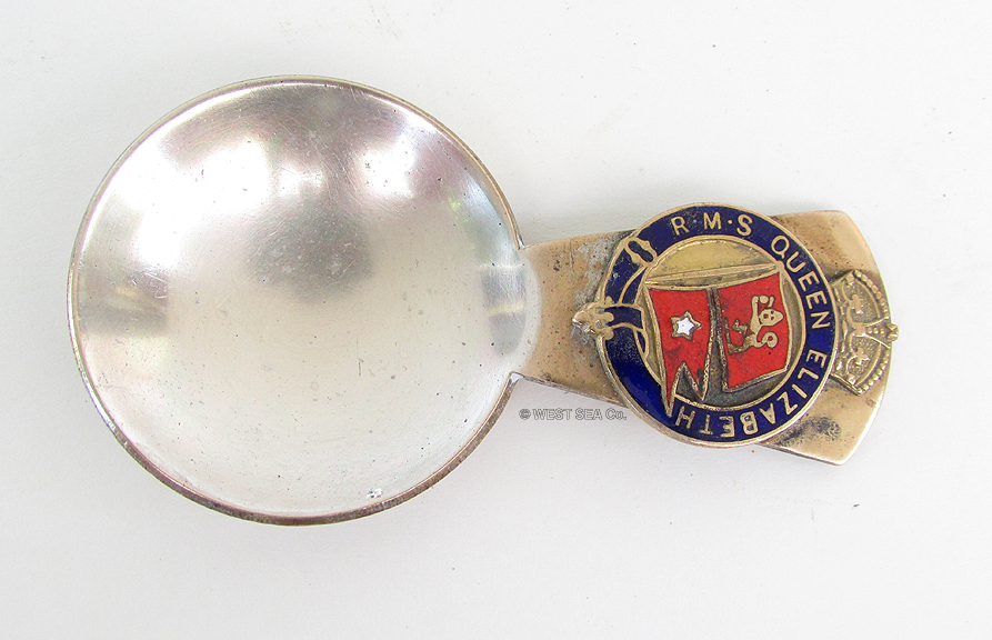 17.42 FAMOUS LINER TEA CADDY. Lovely silverplate solid brass spoon beautifully decorated with the colorful cloisonné mark of the famous White Star Liner RMS QUEEN ELIZABETH. This little spoon was designed to apportion proper amounts of tea in the age when tea was still considered a rare, desirable delicacy of the upper class. The liner crest consists of a crown surmounting the circular belted emblem of the famous ship surrounding a flag hoist of the British lion flag atop a White Star pennant. 2 ¾ inches long and the bowl of the spoon is 1 ½ inch in diameter. Perfect original condition. 49 The RMS QUEEN ELIZABETH was launched on September 27, 1938 by the John Brown Shipyard, Clydebank, Scotland. She was 1,031 feet in length and displaced 83,673 gross tons. As war clouds loomed over Europe in 1939 the brand new passenger liner first entered service as a troopship. At war’s end she entered the passenger trade beginning with her maiden voyage on October 16, 1946. Her final commercial voyage from New York to Southampton was completed on December 8, 1968. Sold to a Chinese businessman at auction in February 1971, she was intended to be fit out as a floating university. But with the £5 million conversion nearly complete, she caught fire in Hong Kong Harbor on January 9, 1972 and was declared a total loss. She was sold for scrap 1974. |