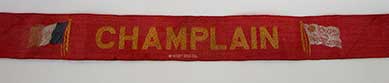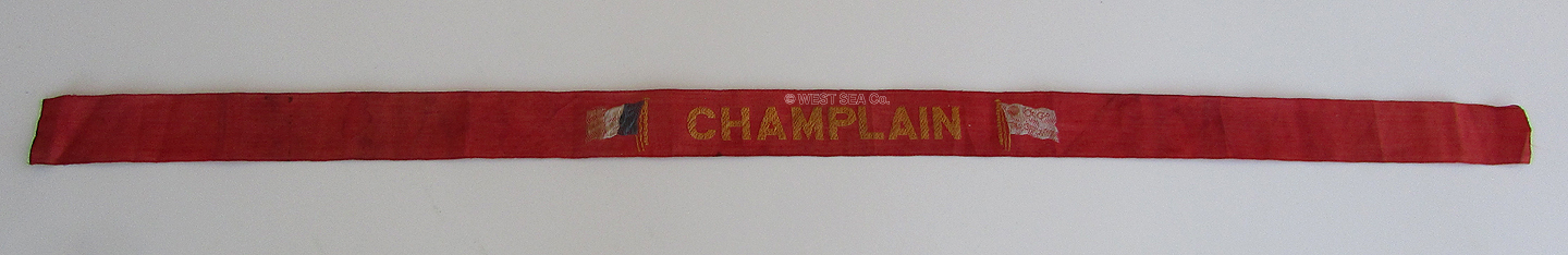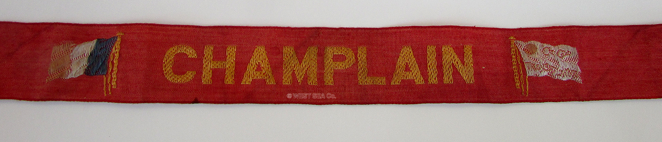 17.45 FAMOUS LOST LINER HAT RIBBON. Rare! Genuine silk embroidered crewman’s hat ribbon from the famous French ocean line S.S. CHAMPLAIN as beautifully embroidered on the long black hat band. Flanking it on the left is the French national ensign and on the right is the house flag of Chantiers et Ateliers. 24 inches long by 1 1/8 inches wide. Nice condition showing minor soiling. 49 S.S. CHAMPLAIN was a cabin class ocean liner built in 1932 for the French Line by Chantiers et Ateliers de Saint-Nazaire, Penhoët. She was sunk by a German mine off La Pallice, France, in 1940. This was one of the earliest passenger ship losses of the Second World. |