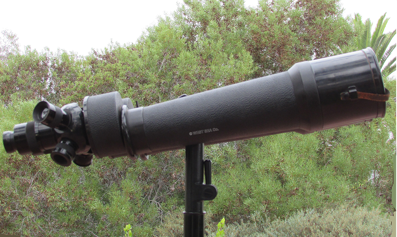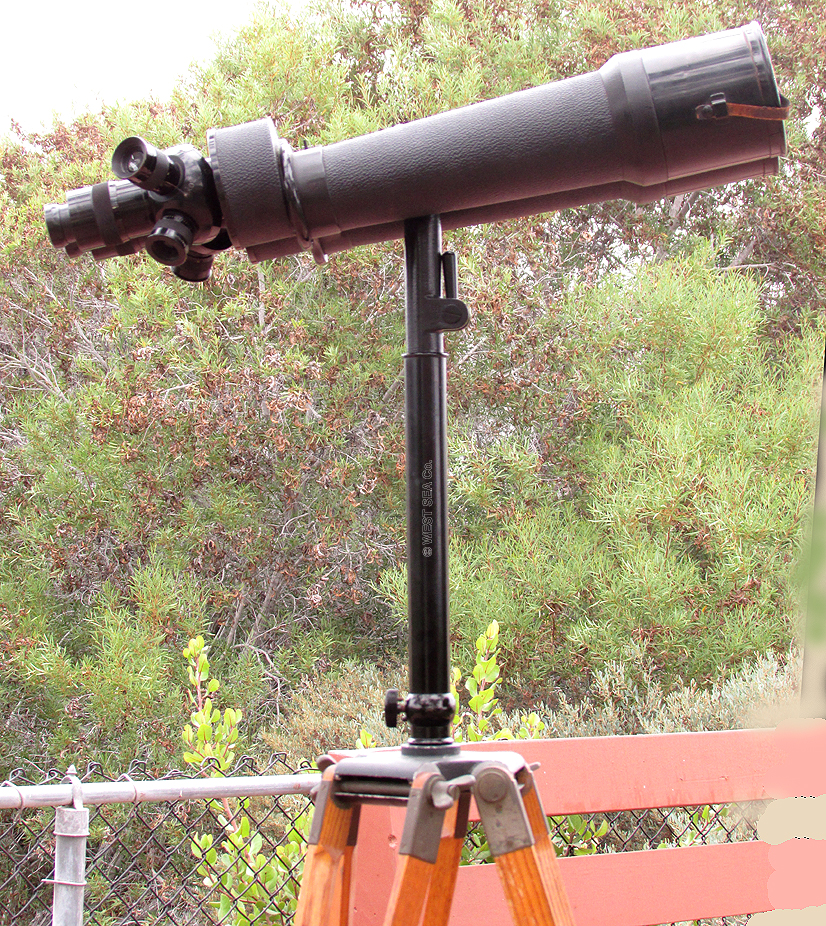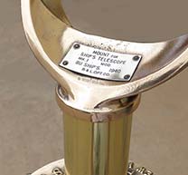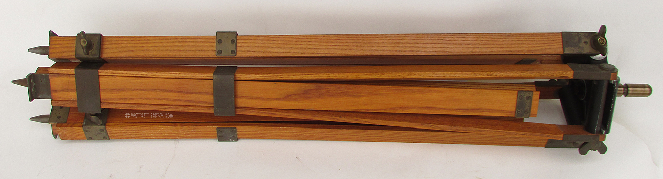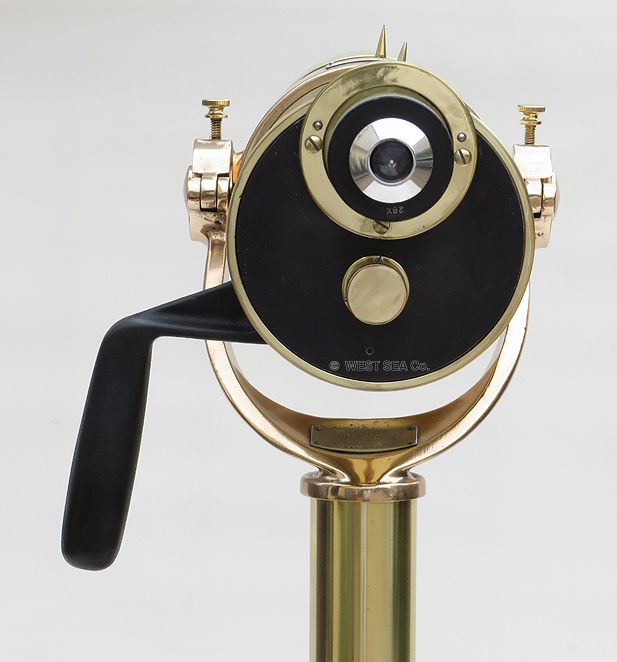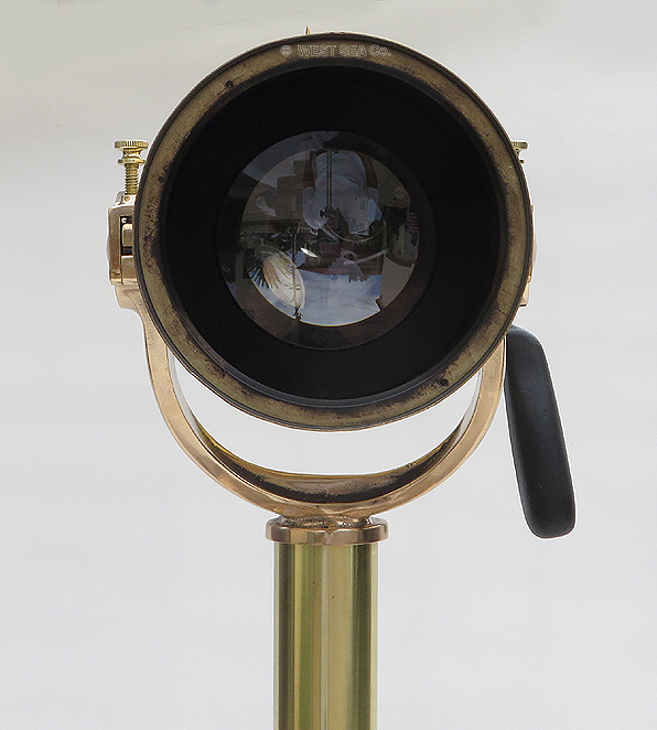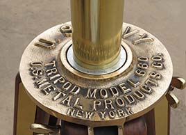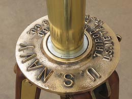 21.03 U.S. NAVY TRIPOD TELESCOPE. Absolutely the ultimate in U.S. Naval optics, this is a pre-World War II vintage flag bridge telescope. A precious few such telescopes were also configured for exploratory landing party use and were mounted to their rarely found U.S. Navy terrestrial tripods.. Because of the stresses and abuse that such arduous use inflicted, few survived. Represented here is a very scarce original example in virtually perfect condition in all respects! Made of heavy solid brass this telescope has the finest state-of-the-art optics of its time produced by the highly respected Bausch & Lomb Optical Co. as marked on the silver maker’s plaque on top of the barrel: “SHIP’s TELESCOPE Mk I MOD. BU. SHIP’S U.S. NAVY (N) 255, 1940 B & L OPT CO.” The barrel has two sighting pins mounted on top and a built-in sun shade protecting the 3 inch objective lens. A large handle is attached to the left side for conveniently training and elevating. A set of internal rotating filters are provided for maximum clarity in sunlit, hazy or low light conditions. They are selected by means of a knurled brass knob just below the eyepiece. The ocular provides a 28X image of exceptional clarity and brightness. Of immense added value and versatility, there are an additional 4 interchangeable eyepieces of 12, 14, 22 and 32 powers! Focusing is accomplished by turning the knurled adjustment ring with a range of -4 to +2 diopters in ¼ increments. The telescope body is supported by its extremely heavy thick bronze collar with trunnions suspended in the equally heavy solid bronze yoke. Removal of the telescope when not in use is made by loosening the hinged trunnion caps with knurled locking lugs. The yoke has a stout bronze support spindle which fits snugly into the tripod “spider,” complete with bearing and even a zerk grease fitting! The end of the spindle is finished off with an extra large brass cap nut. The yoke bears a silver maker’s tag reading, “MOUNT For SHIP’s TELESCOPE Mk I Mod. BU. SHIP’S 1940 B & L OPT. CO.” the spider is also solid bronze and is marked in high relief “U.S. NAVY Tripod model 660 U.S. Metal Products Co., New York.” A brass collar fits over the spindle allowing the height of eye to be raised or lowered by 5 inches. The high quality tripod legs, made of finest hardwood maple have all brass fittings and are tipped with bronze “feet.” A central brass chain allows for splaying the legs to different widths. This feature allows for further height adjustment and stability. The legs are detachable from the spider by means of large brass butterfly wing nuts. The barrel of the telescope measures 28 ½ inches long as pictured with protective screw-on ocular cover. The barrel is 4 ¾ inches in diameter. The entire assembly stands 64 ½ inches tall as shown. This measurement is with the 5 inch height adjusting collar inserted. The footprint of the tripod as shown is 29 inches between each leg. The condition, both cosmetically and functionally of the entire unit is nothing short of spectacular -- particularly in light of the fact it is over 75 years old! At the time of its manufacture, this unit cost the Government more than the price of a car. |