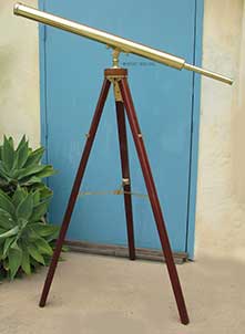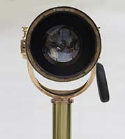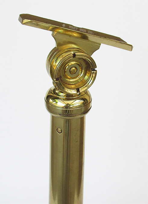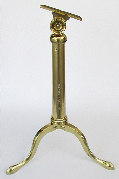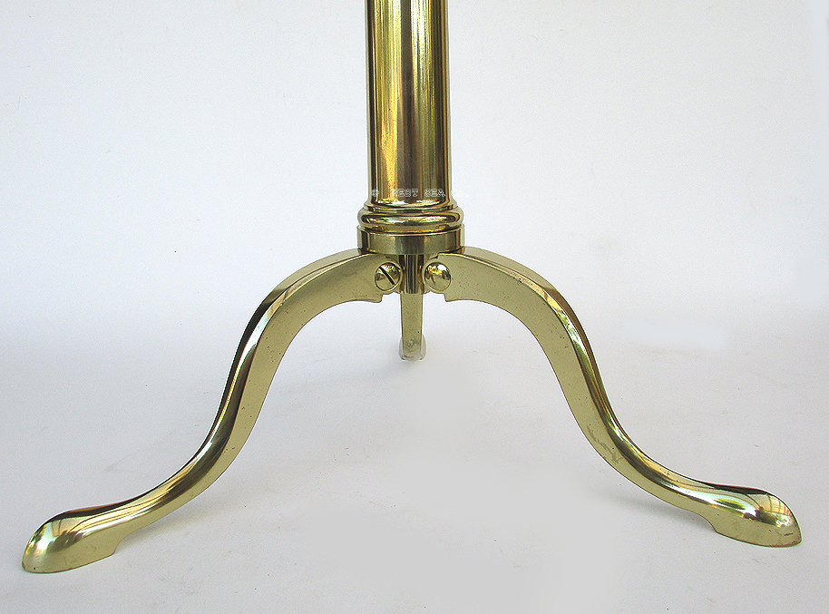 21.06 TELESCOPE TRIPOD. Genuine early 19th century table tripod for a premium quality library telescope of the period. This authentic, heavy solid brass tripod is of English origin with lovely Queen Anne cabriolet tripod legs which support a gradually tapered strut. This strut supports the telescope mount at the top. The mount is fully articulated with train and elevation functions which are smooth and tight with no play – as required of such a quality instrument. 24 ½ inches long overall. 19 inches tall as configured. The footprint is 14 ¼ inches on the three legs. Weight 8 pounds. Outstanding original condition in a high polished brass finish with preservation coating. Guaranteed to be over 100 years old. 695 |