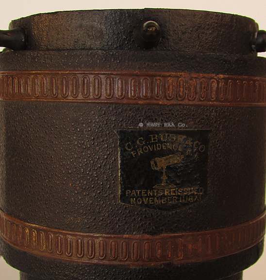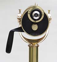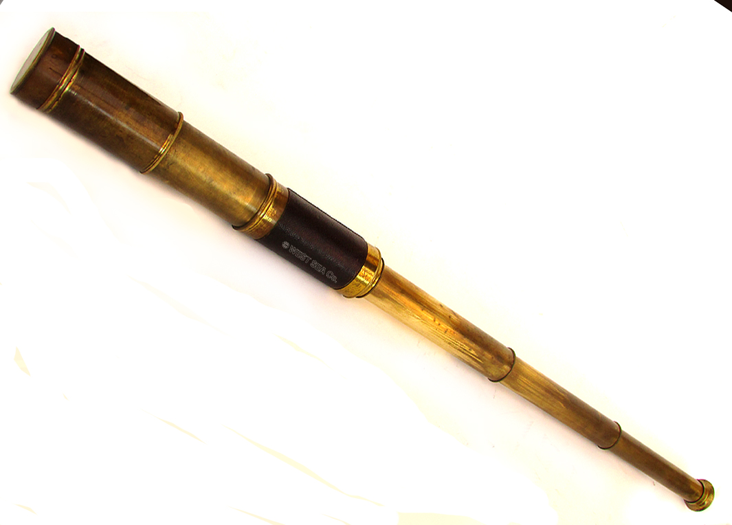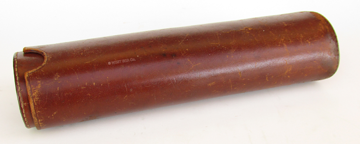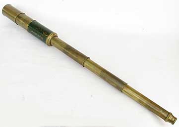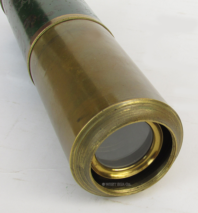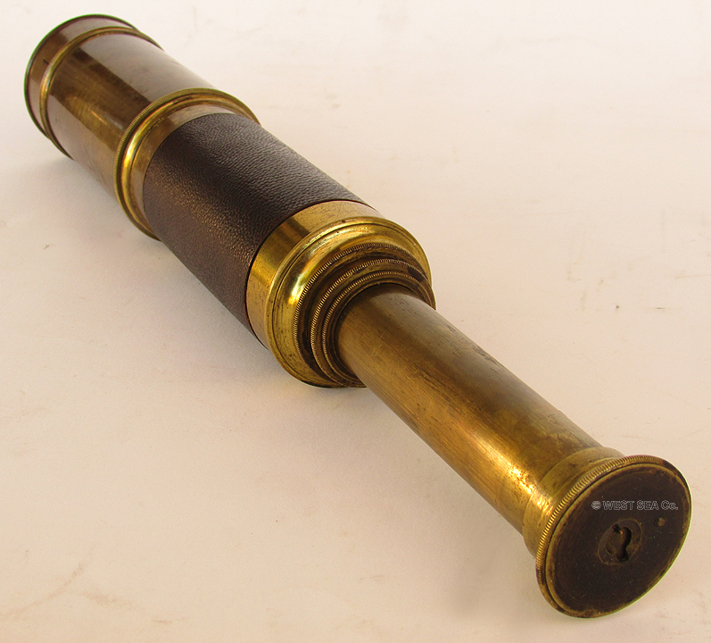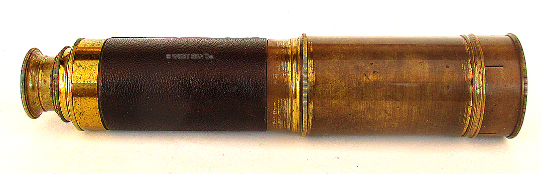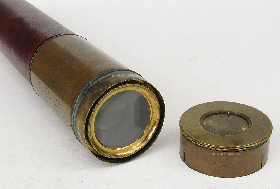21.51 CAPTAIN's SPYGLASS. Extra nice turn-of-the-last century hand-held telescope by the famous Scottish makers "Dobbie McInnes. Ltd. GLASGOW. SOUTH SHIELEDS. LIVERPOOL & LONDON" as beautifully hand-engraved on the draw. This especially large telescope has a main barrel with a sailor-made sail canvas covering, hand-stitched and finished with handsome Turk's Head knots on each end. This form of Marlinspike seamanship is particularly desired by collectors. The single draw has an early style ocular with sliding dust cover. The objective is protected by a sun shade with sliding dust cover as well. Both slides operate properly. The original 5 element lens system is in perfect condition and provides a bright, highly magnified upright image of extreme clarity. 20 ½ inches long closed and 36 inches long fully extended without the sun shade. Excellent original condition. Approximately 120 years old. 949 The namesake of this nautical instrument company, Alexander Dobbie, established the firm in 1841. In 1881 it changed to Alexander Dobbie & Son. In 1902 the firm was incorporated as it appears here, Dobbie McInnes, Ltd. In 1914 the firm advertised itself as "Manufacturers and patentees of nautical and engineering equipment. In 1921 the name changed to Dobbie McInnes & Clyde, Ltd. Interestingly, this form of telescope remained unchanged from those made circa 1810 and later. At the time of its manufacture the magnification or "power" (times X) of early optical systems were not yet calculated. Suffice it to say this state-of-the-art telescope provides an amazingly clear, highly magnified image enhanced multiple times! |