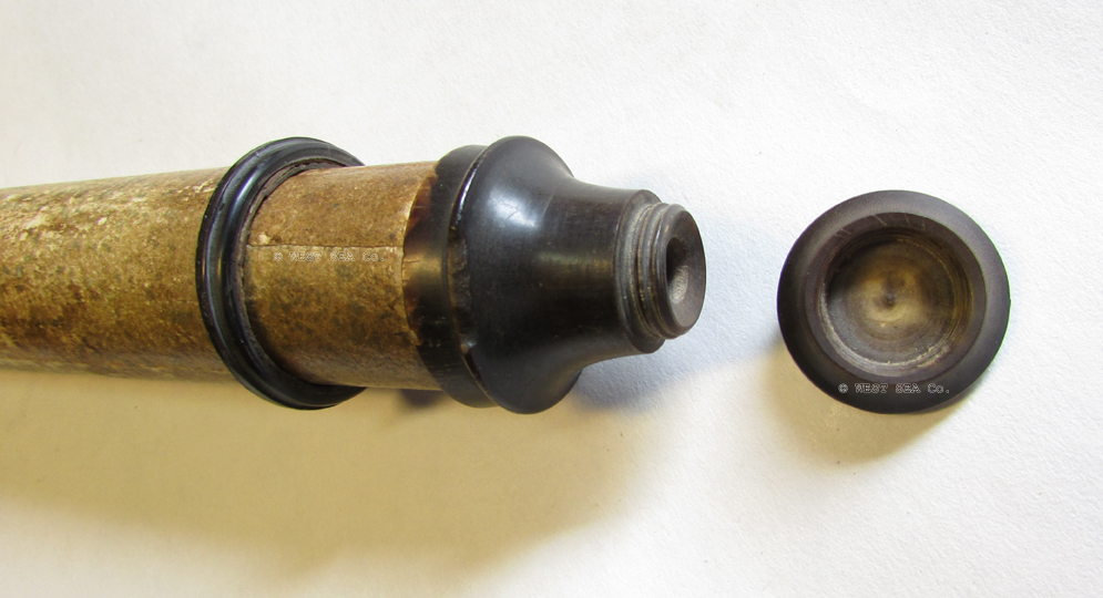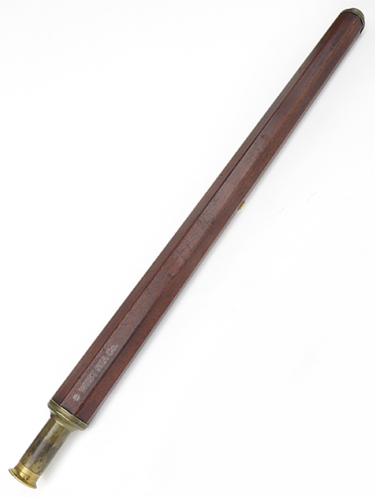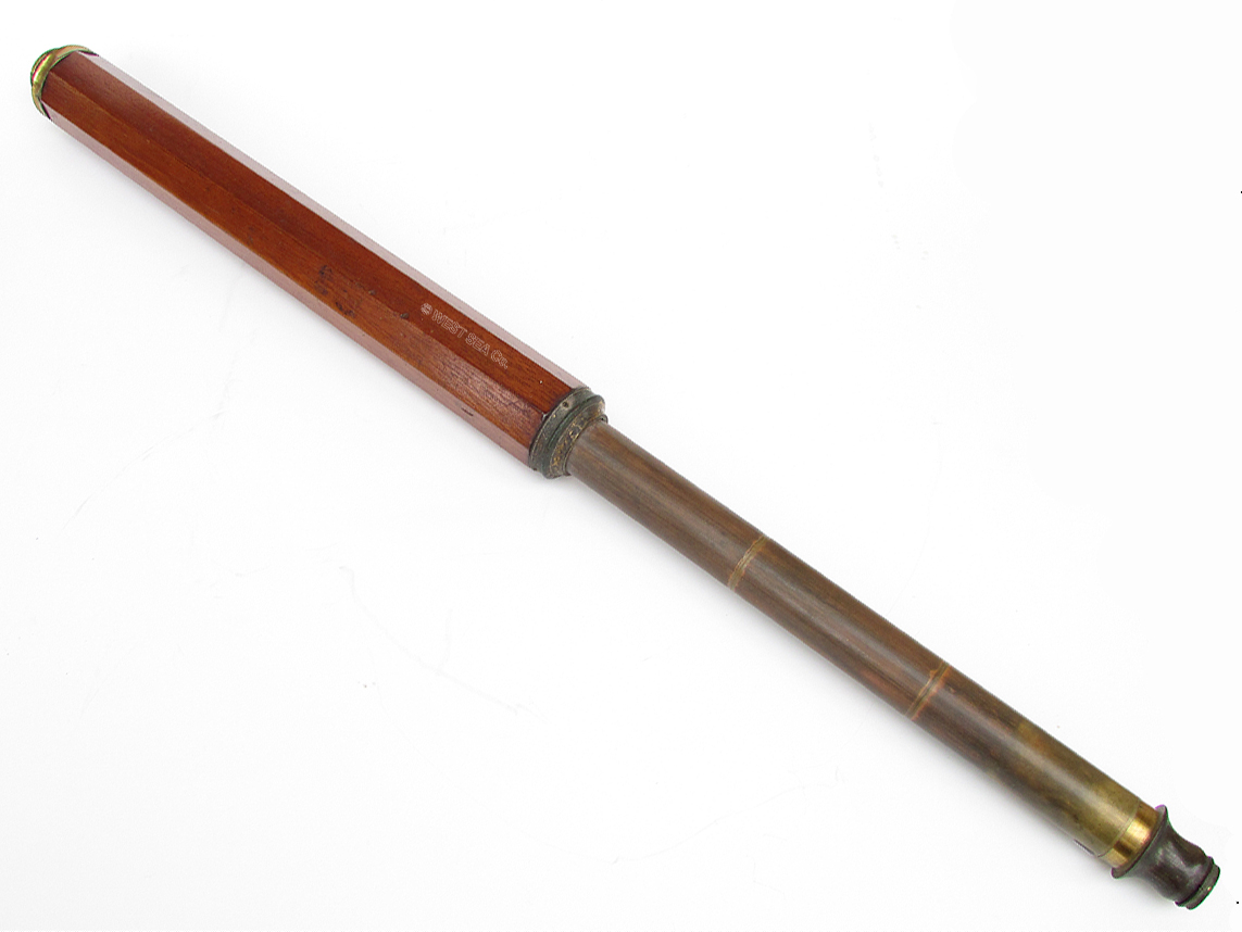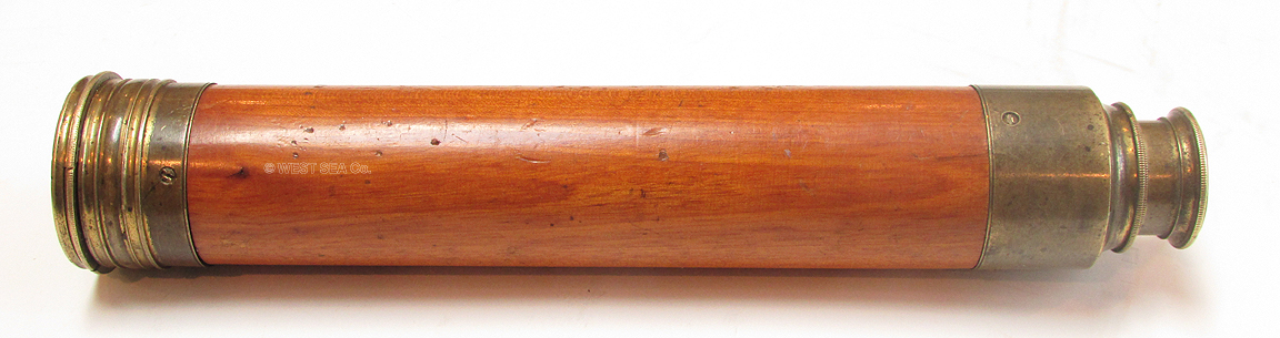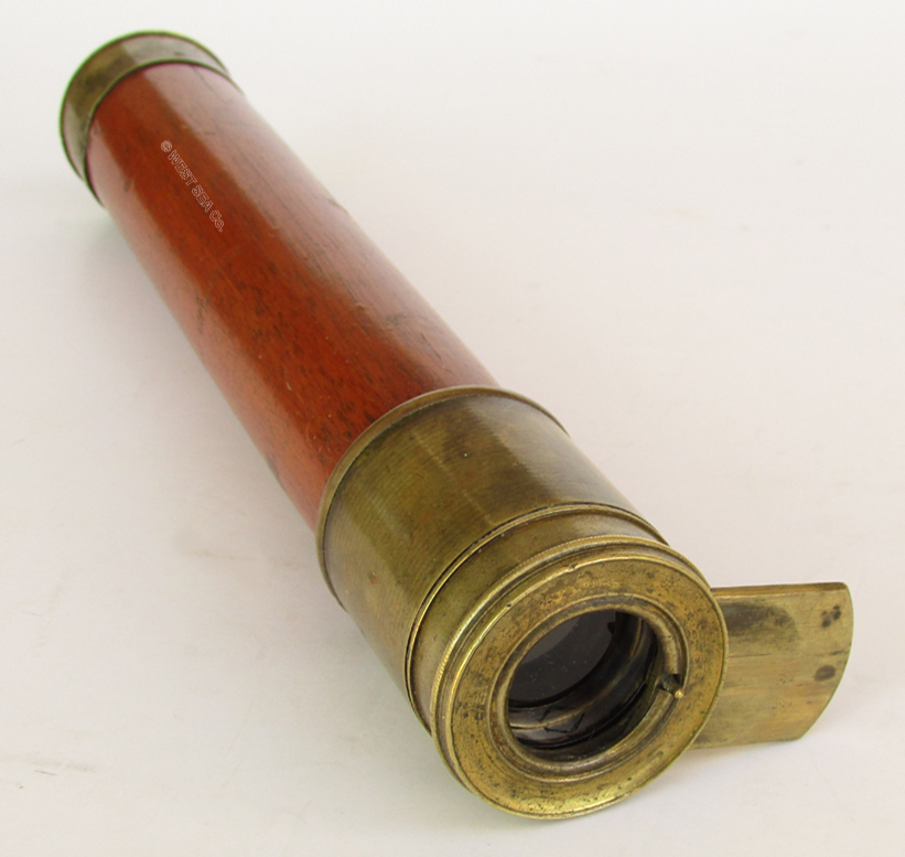 21.60 MINT 18th C. TELESCOPE. Remarkably well preserved Captain’s spyglass from the early days of sail. Of English manufacture, this 8-sided hand-held scope has a solid body carved from rich mahogany. The monochrome objective lens is a mere 5/8 inch in diameter, indicative of its early construction when glass blowing and lens making, free from occlusions, were in their infancy. This lovely artifact is in virtually pristine condition. The objective lens housing still retains its original bright lacquered surfaces and its sliding dust cover. The draw tube is of the early “nipple” form, complete with its sliding dust cover. Speaking to its age, the internal erecting system consists of 3 lenses instead of the more typical 4. Furthermore the individual lenses are held in place by threaded retainers rather than being rolled in place like later telescopes. As such the single draw tube actually consists of 3 threaded separate components. The telescope measures 14 inches long closed expanding to 23 ½ inches fully extended. It measures 1 ½ inches thick. Close to 300 years old if not older! Amazing. 1195 |