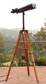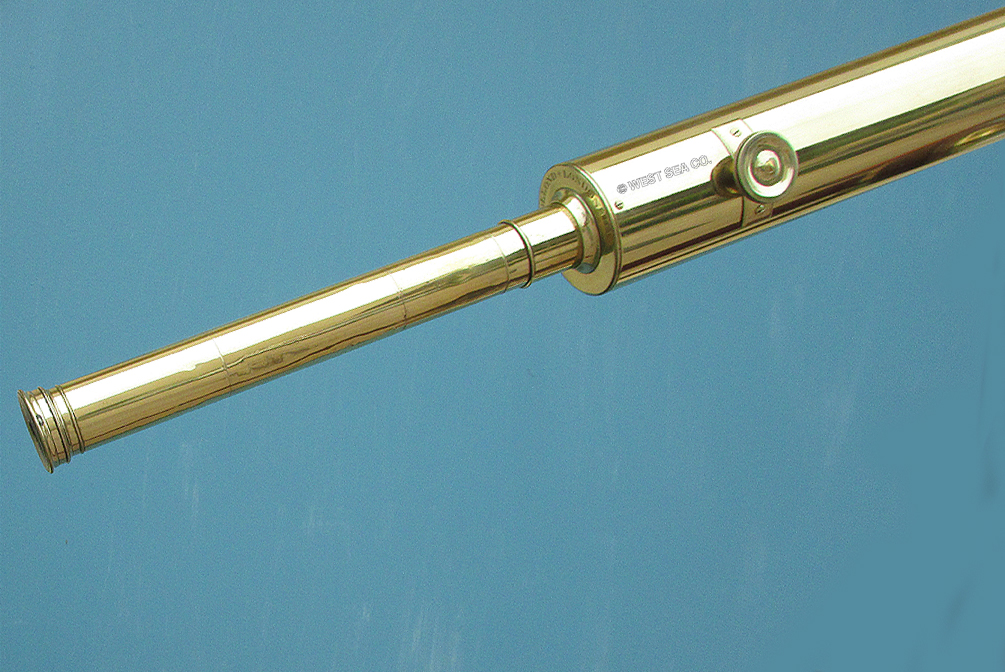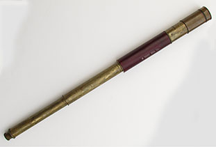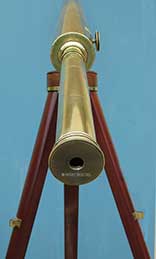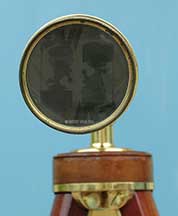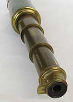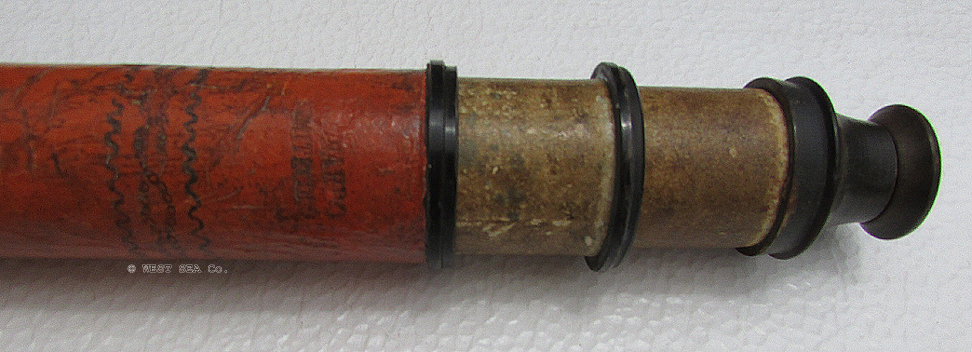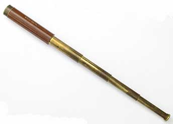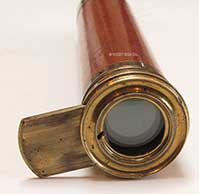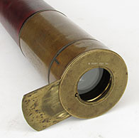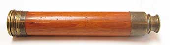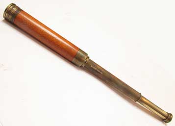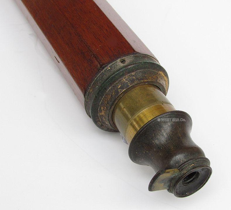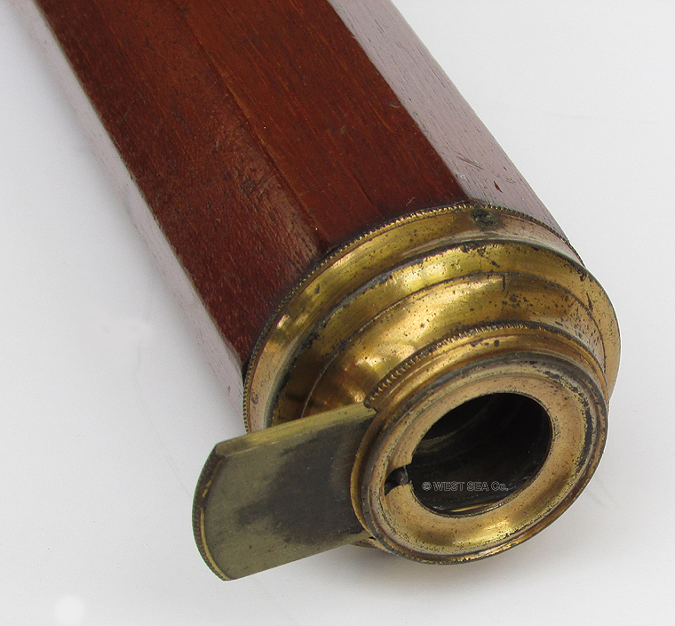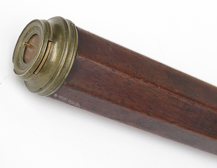 21.04 ANTIQUE TELESCOPE. Very scarce octagonal barrel captain’s spyglass dating from the early 18th century. It is a genuine relic from the early days of sail made in England which features a long 8-side barrel carved from a single piece of rich mahogany. This old sea veteran has several distinctive features which reveal its great age. It has the early form reverse taper characteristic of telescopes manufactured from the 1680's. The objective end with traditional brass collar has a sliding lens cover housing its single piece objective lens measuring only 7/8ths inches in diameter! The draw tube contains only three (not the usual 4) erecting lenses. These single element lenses are held in by threaded retainers, not rolled in as with later 18th and 19th century telescopes. The ocular consists of a later knurled brass eye cup with built-in pivoting dust cover. Another early aspect is the fact that the draw tube slides in and out of the barrel freely with no stop. In combination the all original lens system provides a magnified image with the telltale “chromatic fringe” characteristic of the earliest telescopes. Cosmetically it is in outstanding original condition with no dents cracks or other flaws – just great old age. 25 inches long closed and 30 ½ inches long extended. A beautiful example approximately 300 years old. Certainly a museum piece! Price Request The technology of lens making and the grinding of optical glass was in its infancy at the time this telescope was made. Glass, without occlusions was hard to make. Accordingly, lens makers reverted to small, thin glass lenses which could be enhanced by increasing their focal lenth. The result was the charateristic long telesope barrel with very small objective lens. But Peter Dollond's patent of the achromatic lens in 1758 changed telescope manufacturing for the ages. |