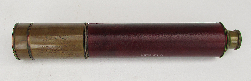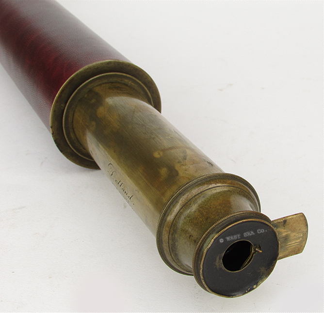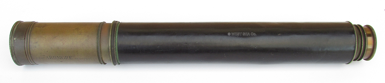 21.63 IMPORTANT IDENTIFIED TELESCOPE. Very scarce, authentic sailing ship telescope from the 1800’s engraved with the ship’s name! This handsome 19th century relic was manufactured by one of England’s most notable scientific instrument makers and opticians of the time, “Day or Night PANCRATIC H. Dallmeyer, London” as beautifully- engraved on the draw tube. In additon it is engraved "SHIP ARDMORE." This single draw telescope with its 1 ¾ inch doublet object lens along with the 4-element internal erecting system lenses provides a clear, highly magnified upright image free of chromatic distortion. The all brass body retains its original black leather covering in excellent condition. Closed, it is 17 inches long. Fully extended with sliding sun shade it measures 31 ¼ inches overall. Complete with original press-on objective lens cover. 1395 Identified saling ship's teleopes are incredibly hard to find. Perhaps one in a hundred such telescopes are so identified. As such this offering is a rare rare bargain, especaially given ints pristine conditon! The full rigged 3-masted sailing ship ARDMORE was built in Glasgow, Scotland at the famous Clyde Yard in 1875. She served until 1896. Henry Dallmeyer worked as an Optician at 15 Castle Street, Holborn, London from 1851. (Gloria Clifton, “Directory of British Scientific Instrument Makers 1550-1851;, 1995, Swemmer, Philip Wilson Publishers, London.) “Day or Night PANCRATIC” refers to the state-of-the-art in optics attained by Dallmeyer. Up to the early 1800’s telescopes were produced specifically for Day, Night, or hazy conditions. Dallmeyer’s claim “pancreatic” (having all or many degrees of power, especially in microscopes) meant this telescope functions equally well in all conditions. |