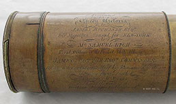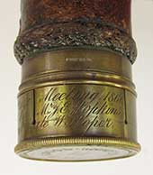 21.56 PRESENTATION TELESCOPE. Finest quality mid-1800s telescope by “E. G. WOOD, 74 Cheapside, London” as stamped on the objective lens cap. Then, as hand-engraved in cursive script is the presentation reading “7th S.V.R. Prize Meeting 1866 Presented by Mr. E.H. Hopkins Won by Private W. Roper.” This diminutive 3-draw gentleman’s telescope is all brass with leather covering the main barrel. The one inch doublet objective, along with the 4 original internal lenses, produces an image of surprisingly high magnification and extreme clarity. The telescope measures 5 ½ inches closed and 15 inches long fully extended. Functionally the condition is outstanding. Cosmetically, the leather covering is separated at the seam. Presentation telescopes of this size are quite rare! WAS $795 NOW! 249 Edward George Wood was a philosophical and mathematical instrument maker in London from 1833-1839. (Gloria Clifton, “Directory of British Scientific Instrument Makers 1550-1851,” 1995, The National Maritime Museum Greenwich.) With further research the nature of this presentation may be fully discovered. Likely it was an award given to a Private in the 7th S.V.R. (regiment) for outstanding performance. |