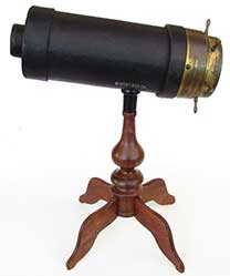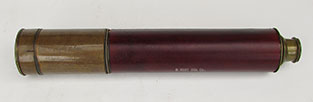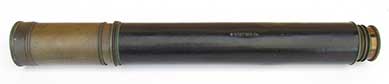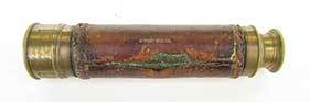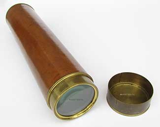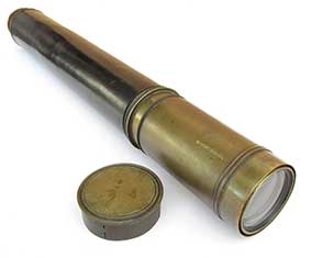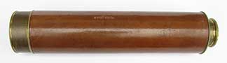 21. 59 TELESCOPE. Extra nice hand-held telescope from the early 1800’s. This unmarked 4-draw telescope is certainly of English manufacture. It has 1 ¾ inch achromatic objective lens in perfect condition, protected by its original press-on lens cover. Together with the original 4 element internal lens system it provides a highly magnified upright image of unparalleled clarity. Speaking to its age (circa 1830) it has the typical “flat” eyepiece with pivoting ocular dust slide characteristic of that era. This telescope is of all brass construction with leather covering which is in exceptionally fine, virtually mint condition. It measures 9 inches long closed and expands to an amazing 30 ¼ inches with a smooth tight action. They really don’t come any nicer than this! 795 |