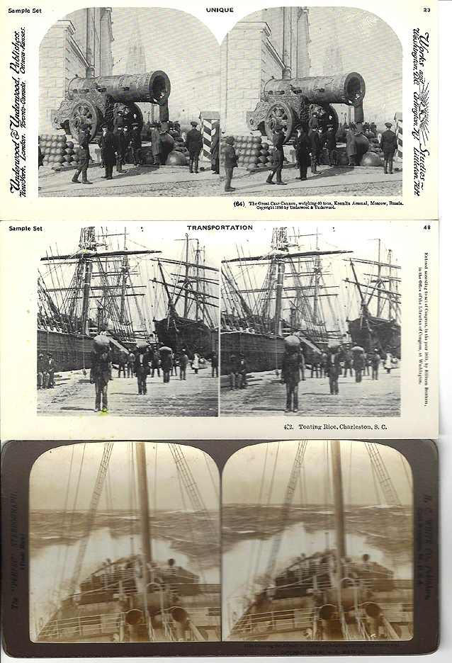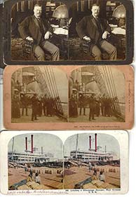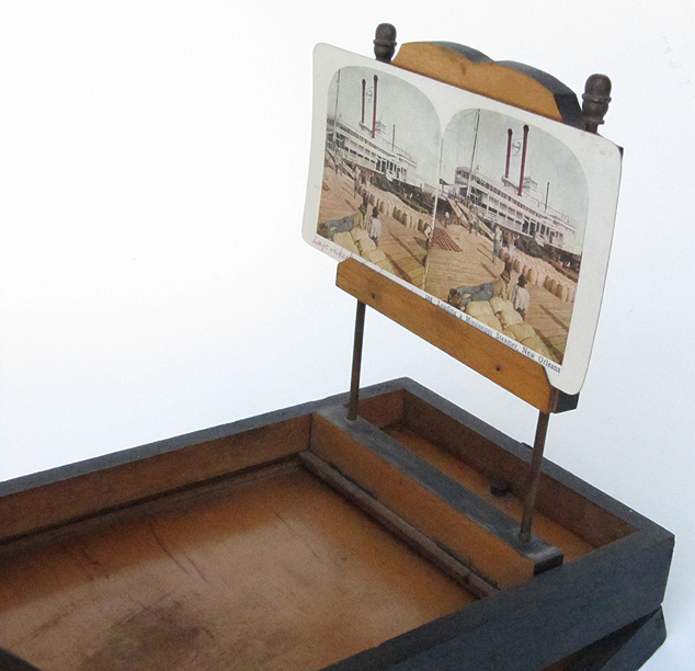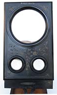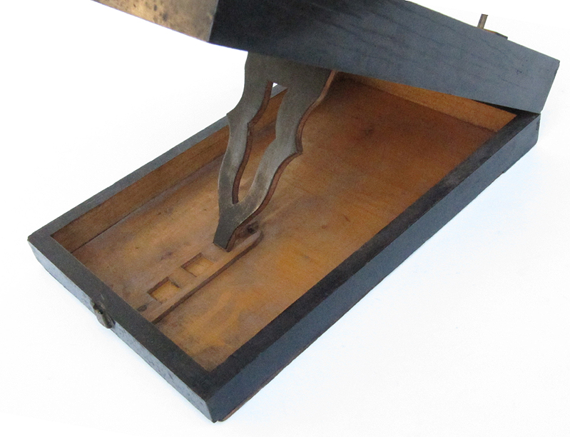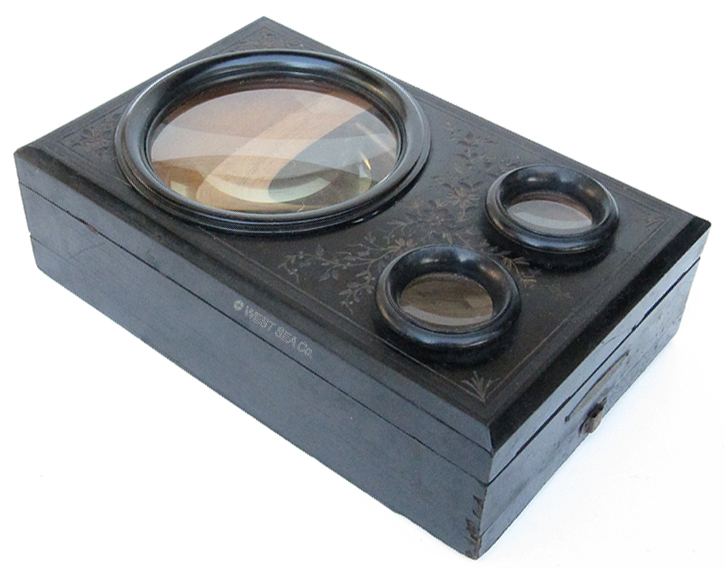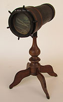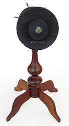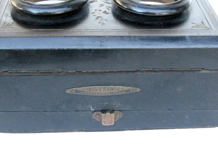 21.79 EXTRA FANCY VICTORIAN ERA STEREO VIEWER AND MAGNIFIER. This beautiful, high quality optical instrument is as decorative as it is functional. It consists of three-tiers of ebonized hardwood profusely engraved with floral decorations embellish in gold. On the top front is a large monocular lens for viewing photographs in detail. Below it a pair of oculars are for viewing stereo cards. A height-adjustable pierced wooden support mounted on two brass rods is provided for holding a card or photo. It is also adjustable for depth, sliding back and forward in grooves on each side. The front of this viewer is hinged with a brass “stay” on the right to lock it in the upright viewing position. When not in use it folds closed on a friction latch. The bottom tier is equipped with a wooden track and folding arm which allows the viewer to be inclined to one of three preset angles. The front bears the oval brass maker’s plaque reading “76 .UNIS . FRANCE 3 STEREOSCOPES - PARIS” 10 ½ inches long by 6 ¾ inches wide and 3 inches thick when closed, elevating to a working height of 16 ¾ inches. Superb original condition. 1395 |