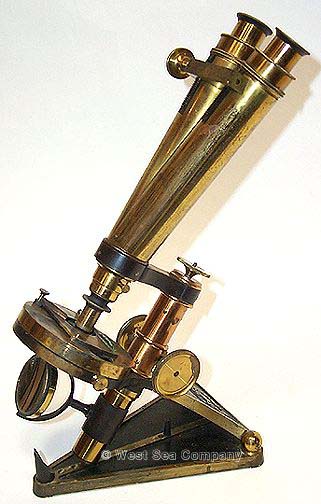 21.4 BINOCULAR MICROSCOPE. High grade 19th C. English microscope made for the American market, signed and serial numbered on the base "R. & J. Beck, London 7072." and further engraved on the main tube "J W QUEEN & Co. Agents, Philadelphia & New York." This finely crafted all brass compound microscope features adjustable Wenham-style binocular body tubes mounted on a sturdy base and stands 14 inches tall as shown. It is complete with a total of 4 objectives and 4 ocular lenses. It is housed in a lovely African mahogany box with brass furniture measuring 16 inches long. The lower till houses numerous glass slides while the upper section holds the additional optics, with 11 slots being empty including a separate slot for a light magnifier which is also missing. Of course the beauty of the innovation embodied in this microscope was the fact that the researcher could view a particular object with both eyes providing a clearer stereoscopic subject. This rare instrument is in excellent, untouched original condition with most of its original lacquered surfaces. It is functional and all adjustments operate smoothly and properly. A most handsome presentation! WAS 2195 NOW! 995 |
