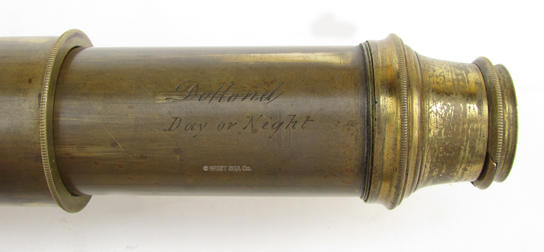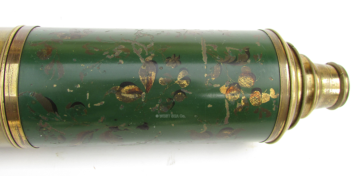 21.40 DECORATIVE TELESCOPE by the MASTER. Very rare, particularly nice example of a late 18th century hand-held captain's spyglass by the inventor of the achromatic lens, Peter Dollond, as beautifully hand engraved in script on the first draw "Dollond Day or Night." What is most unusual about this handsome 3 draw telescope is the fact that it is decoratively painted with gilded floral scrolls on a green background on the main barrel. This is most unusual! The telescope has its traditional 4 element lens erecting system, which in combination with Dollond's signature achromatic objective lens, provide a clear, upright, highly magnified image free of color distortion. This telescope measures 35 inches long fully extended and 2 ½ inches in diameter. When closed it collapses to a mere 11 ½ inches. Excellent original condition in all respects. The old style nipple eyepiece retains its original dust slide. The objective cover is away. This is the first such decorated sea going spyglass we have encountered in our 40+ years! 975 |