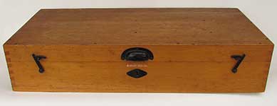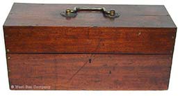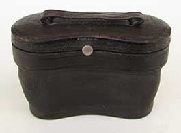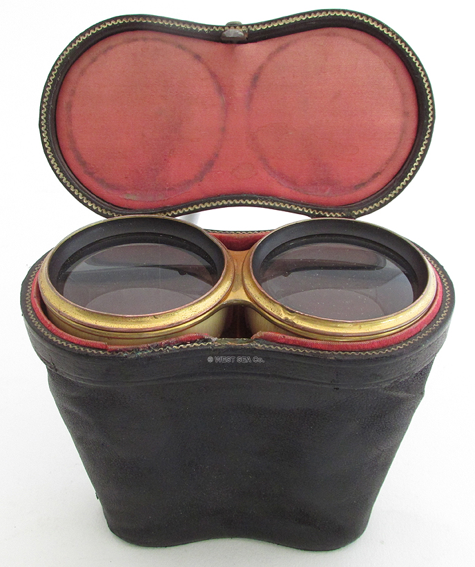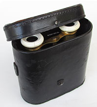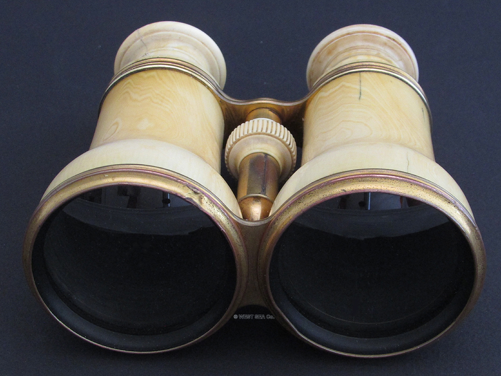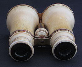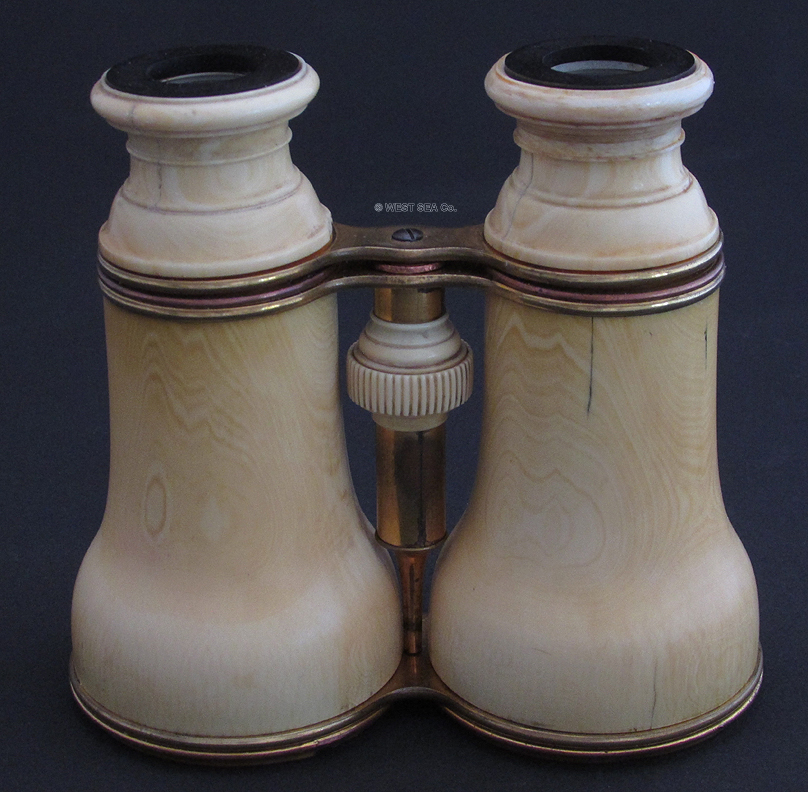 21.88. LARGE IVORY BINNOCULARS. A really incredible pair of 19th century binoculars with the bodies turned out of solid ivory! This handsome, super high quality optical instrument was obviously designed to be a cut above the usual instruments of its type with leather-covered brass bodies. Most likely of French manufacture this set exhibits the quality and craftsmanship indicative of French opticians in the 1800’s, as exhibited in this particularly difficult medium. The large twin objective lenses measure 2 ½ inches in diameter and are 5 inches wide overall. The gilt brass frames secure the lenses within the solid ivory bodies. Another set of gilt brass frames hold the oculars. Within each is a circular ebony eyepiece. The binoculars focus by turning a ribbed ivory knob in the center, extending from 4 5/8 inches closed to a full 6 1/8 inches. This action is very tight. The all original lenses combine to produce a stereoscope image of great clarity with good magnification and light gathering capability. Remarkably these old binoculars show relatively little cracking expected of such a medium about 150 years old. There is the obvious wear and age patina. The original satin-line leather carrying case is also in remarkable condition, complete with original carrying strap. The case measures 5 ½ by 5 by 3 inches and closes with a brass button latch. 895 |