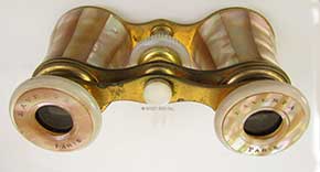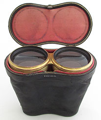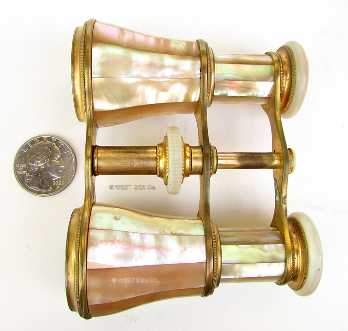21.54 FRENCH OPERA GLASSES. Lovely pair of 19th century opera glasses by the noted makers “Lavista, Paris” as delicately engraved on each of the eyepieces. This high-quality optical device features twin tubes providing depth-of-field viewing superior to a telescope. They are totally encrusted in luminescent mother-of-pearl with gilded brass connectors. Even the draw tubes are adorned with tight sections of M.O.P! These provide a unique “deep” quality on their surfaces. The twin glasses focus with a smooth tight action activated by a knurled M.O.P. wheel at the center. This offering is complete in its black leather carrying case with purple satin lining. It is in remarkable, virtually pristine condition. The glasses themselves are in equally fine condition belying their century plus old origins. The glasses are 4 inches wide in sum, with each objective lens measuring 1 ¼ inches in diameter. Fully extended the set measures 3 1/8 inches long. The leather case is 4 ½ inches wide by 3 inches high and 2 inches thick. Amazingly the case still retains its original sturdy strap handle and original button snap closure. These are features rarely found in such outstanding condition! This set would make a treasured gift to a special loved one… at that, for a very reasonable price. 189 |