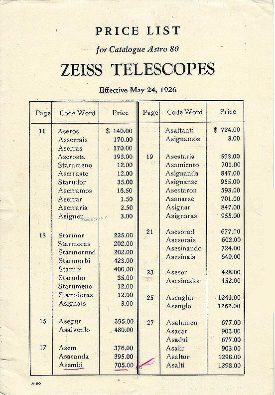21.64 EXTREMELY IMPORTANT TELESCOPIC BINOCULARS. This is an opportunity to acquire one of the world’s finest optical devices ever produced. It was made by the famous Carl Zeiss, Jena (Germany) Company. This truly extraordinary set of binoculars was the top of the line of company’s output known as their “ASEMBI” model, featured in their rare original 1926 catalogue (included in this offering). The all brass construction features two long tapering telescope barrels in black crackle finish. The huge objective lenses are 80 mm in diameter. The rotating eye pieces provide 3 different powers: 12, 20 and 40 x. Accordingly, the set is technically known as 12 x 80, 20 x 80 and 40 x 80 binoculars respectively. Each of the 6 oculars focus independently from -10 through +10 diopters. The back of the left barrel is marked “CARL ZEISS JENA.” The back of the right barrel is marked “D.F. 80 x 500 Nr. 11315.” Between the barrels there is a “gun sight” for precise positioning of the object being viewed. The twin barrels are mounted on a pivoting black lacquered brass support with a locking lever that can be set at any angle (elevation) for viewing. It also allows the binoculars to slew (train) a full 360 degrees in either direction. The support fits over a brass column affixed to the top of the accompanying tripod. The top of such a tripod is known as the “spider.” The aluminum spider has 3 attachment points for the very sturdy oak and brass tripod legs. The heavy duty apparatus is height adjustable using brass thumb screws at the bottom of each leg. The arrangement provides a height from 30 ½ inches to 55 inches from the ground to the top of the spider platform. Each of the tripod legs are fitted with durable steel tips. The fittings are all solid brass. The overall configuration allows for a height of eye from 56 to 73 inches, or approximately 6 feet tall. Note: this is not the overall height, it is the height to the observer’s eye. Remarkably, the entire presentation comes complete with its original dove-tailed hardwood (ash or maple?) carrying case of superior quality in perfect condition. The legs may be detached from the spider and fit into the box. (Not shown here). The box has black lacquered steel fittings, hook and eye closures, brass hinges and a large brass skeleton key lock with both original skeleton keys. The box measures 32 ¼ inches long, 15 inches wide and 7 inches thick. The quality and condition of the entire presentation cannot be overstated. Simply put, everything is in MINT original condition throughout, with NO flaws. The carrying case does exhibit some age patina of the exterior surfaces after a century. The interior is as the day it was made! It does not appear that this set was ever used. We are honored to be able to offer this for private sale. 21,495 The original price list and catalogue (included with this offering) indicate the price of the Asembi model to be $705.00 dollars effective March 24, 1926. That price equates to $21,626 in current dollars. Effectively then, we are selling this rare antique which has survived in mint, unused original condition for nearly 100 years, for LESS than it originally cost! Ex. Noted museum collection. The identity of the museum will be given to the ultimate buyer. COMPS:< /br> Kodner Galleries, Dania Beach, Florida advertised a pair of 1930 Japanese binoculars of World War II vintage of similar form in 2015. They sold for $71,000 each. Another advertisement from Daniels Antiques of Hallandale, Florida offered similar aluminum binoculars priced at $75,000 each in 2011. Original verifying documentation accompanies this offering. |