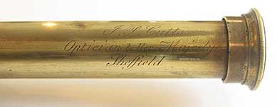 21. 65 FINE CAPTAIN’s TELESCOPE. Superb, early second half of the 19th century English sea captain’s hand-held telescope made by one of England’s finest makers in the early 1800’s, “ J. P. Cutts, Optician to Her Majesty, Sheffield” as signed in flourishing hand-engraved script on the first draw. The distinctive form of this diminutive 2-draw telescope belies its circa 1840 manufacture. It has a classic 18th century brass objective and wooden barrel, suggesting a much earlier origin. The objective retains its early style sliding dust cover. The ocular is complete with a similar slide. This telescope measures 8 inches closed extending to 17 ¼ inches. It produces a clear, highly magnified upright image free of chromatic distortion. The condition is truly exceptional and original in all respects. A sweetheart of such a scope over 175 years old! Offered here at a greatly discounted price. 295 John Preston Cutts was a highly respected English telescope maker in the first quarter of the 19th century. In 1822 he began his manufactory Near St. Paul’s Church in Sheffield, England. From 1828-1841 he worked at Division Street Sheffield, England where he won patronage from the newly- crowned Queen Victoria. (Gloria Clifton, “Directory of British Scientific Instrument Makers, 1550-1851,” 1995, Philip Wilson Publishers, Ltd., London, The National Maritime Museum). |