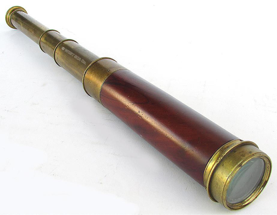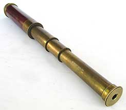 21.04 ANTIQUE TELESCOPE. Very scarce octagonal barrel captain’s spyglass dating from the early 18th century. It is a genuine relic from the early days of sail made in England which features a long 8-side barrel carved from a single piece of rich mahogany. This old sea veteran has several distinctive features which reveal its great age. It has the early form reverse taper characteristic of telescopes manufactured from the 1680's. The objective end with traditional brass collar has a sliding lens cover housing its single piece objective lens measuring only 7/8ths inches in diameter! The draw tube contains only three (not the usual 4) erecting lenses. These single element lenses are held in by threaded retainers, not rolled in as with later 18th and 19th century telescopes. The ocular consists of a later knurled brass eye cup with built-in pivoting dust cover. Another early aspect is the fact that the draw tube slides in and out of the barrel freely with no stop. In combination the all original lens system provides a magnified image with the telltale “chromatic fringe” characteristic of the earliest telescopes. Cosmetically it is in outstanding original condition with no dents cracks or other flaws – just great old age. 25 inches long closed and 30 ½ inches long extended. A beautiful example approximately 300 years old. Certainly a museum piece! 1350 The technology of lens making and the grinding of optical glass was in its infancy at the time this telescope was made. Glass, without occlusions was hard to make. Accordingly, lens makers reverted to small, thin glass lenses which could be enhanced by increasing their focal lenth. The result was the charateristic long telesope barrel with very small objective lens. But Peter Dollond's patent of the achromatic lens in 1758 changed telescope manufacturing for the ages. |