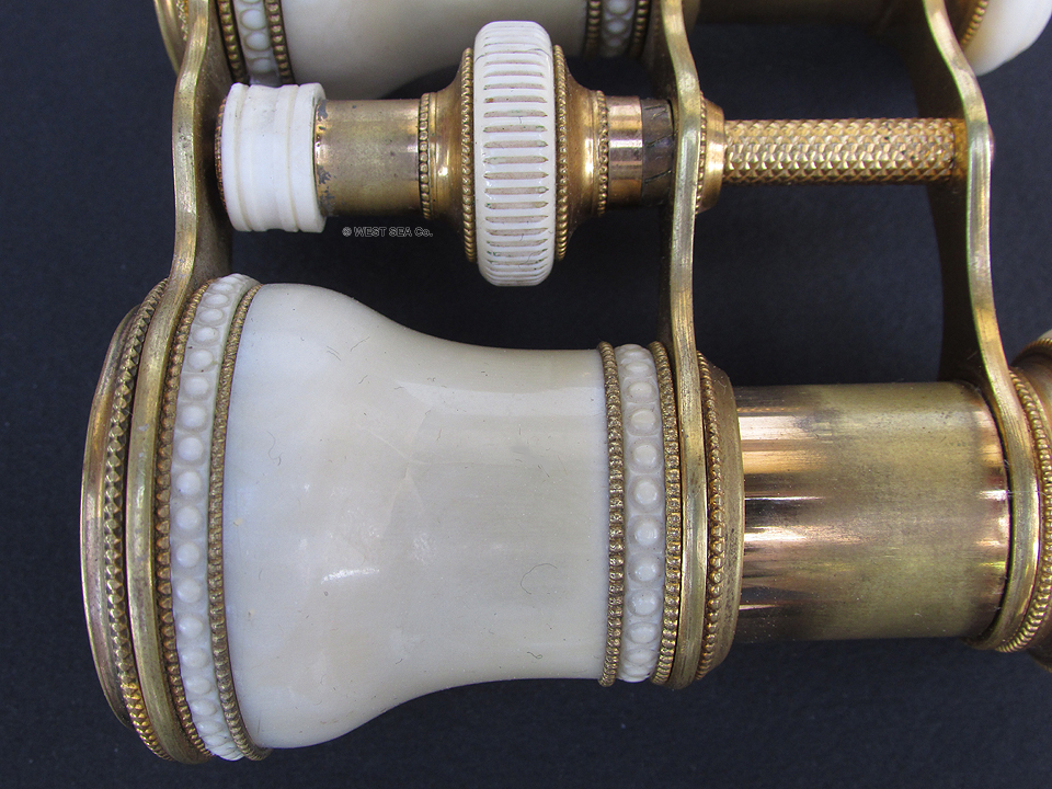 21.87 CASED BINOCULARS. Exquisite, highly finished 19th century binoculars/opera glasses made of solid ivory with gilt-washed brass fittings. Undoubtedly of French manufacture, this exceptional pair, befitting a queen, is of the highest order we have ever seen in our 40 years in this business. The brass and the ivory trim is magnificent. See is believing! The main body is of ivory inset with powerful lenses. The oculars are decoratively turned of solid ivory. It comes complete with a period leather case with hinged lid, in excellent condition. These binoculars measure 3 ½ by 4 ¼ inches wide. The objective lenses measure 1 ¼ inches in diameter. The stout fitted leather case is 5 1/8 inches wide by 5 inches high. Minor age checks do exist in the eyecups and some light wear to the rich gilding is apparent. Otherwise the entire presentation is perfect, including the all original optics which provide a clear upright image of high magnification with good light amplification. This is very rare offering. Check around before buying here. |