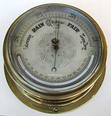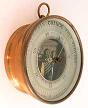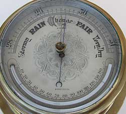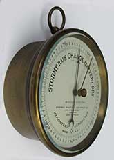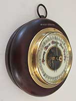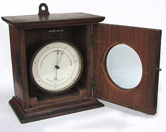 22.55 SAILING SHIP BAROMETER. Noticeably scarce, genuine 19th century ship’s barometer housed in its protective wooden cabinet. This unusual presentation consists of an aneroid (without liquid) weather barometer in its brass case with white enameled dial under glass. Its wide scale is calibrated in inches of mercury from 24 to 31 divided in 2/100th increments. It bears the standard weather indications reading “STORMY, Much Rain, Rain, CHANGE, Fair, Set Fair and VERY DRY.” The reading is pointed by a fine blued steel indicator needle overlaid by a brass set needle with knurled knob, rove through the beveled glass to track changes. The bottom of the dial is marked “HOLOSTERIC BAROMETER” and bears the circular trademark “PNHB,” that of the most famous and prolific French barometer maker Paul Naudet, Paris. The back of the brass case is similarly marked. The case has a suspension loop at the top which engages a small hook on the inside of the cabinet. The unique wooden cabinet is beautifully hand-made of solid teak with decorative parquetry sections. This is NOT a production item, but was most certainly made on board the ship by its skilled carpenter! It has a old wooden door inset with wavy glass, hinged on the right, opening on the left, secured with a brass hook and eye. The top of the case has a thickt brass hanging bracket. The barometer itself measures 5 inches in diameter. The cabinet is 7 ¾ inches wide by 8 ½ inches tall and 5 inches deep. Outstanding original condition in all respects. The barometer is functional and accurate. Without a doubt this is the most unusual ship’s barometric item we have encountered in our 40 + years. 895 Why a sailing ship barometer? Steamships of the late 1800’s into the early 1900's had enclosed pilot houses and chart rooms protected from the harsh environment of the open sea. On the otherhand, wooden sailing ships were far more exposed to the damp, wind and extremes of temperature – all of which adversely affected the accuracy of a barometer. This marvelous custom-made cabinet was truly a bit of genius. It is rare, both in its uniqueness and its survival! Any knowledgeable maritime collector adds a feather in his/her cap with this acquisition. A true museum piece at a very, very resonable price in these infrlationary times! Go buy gas! |