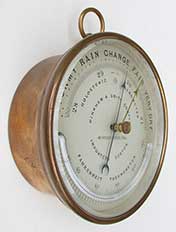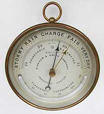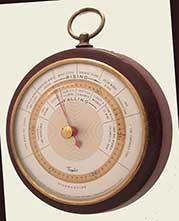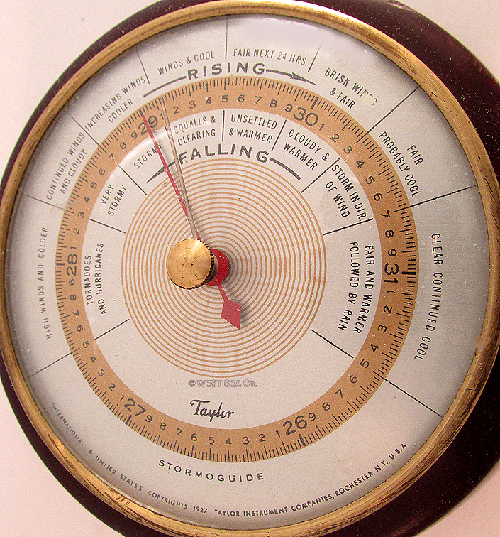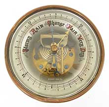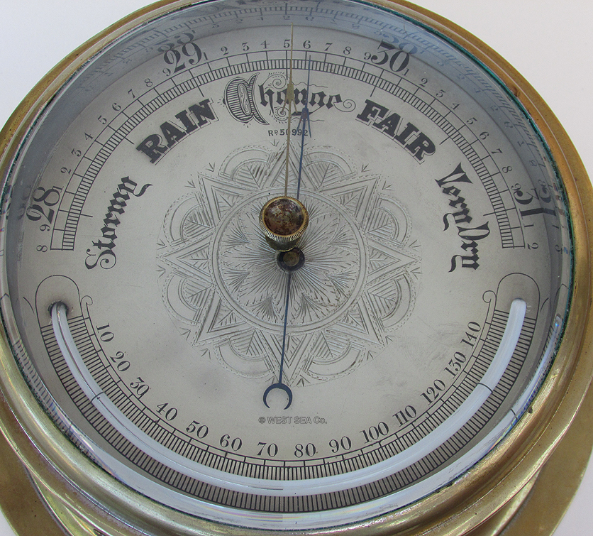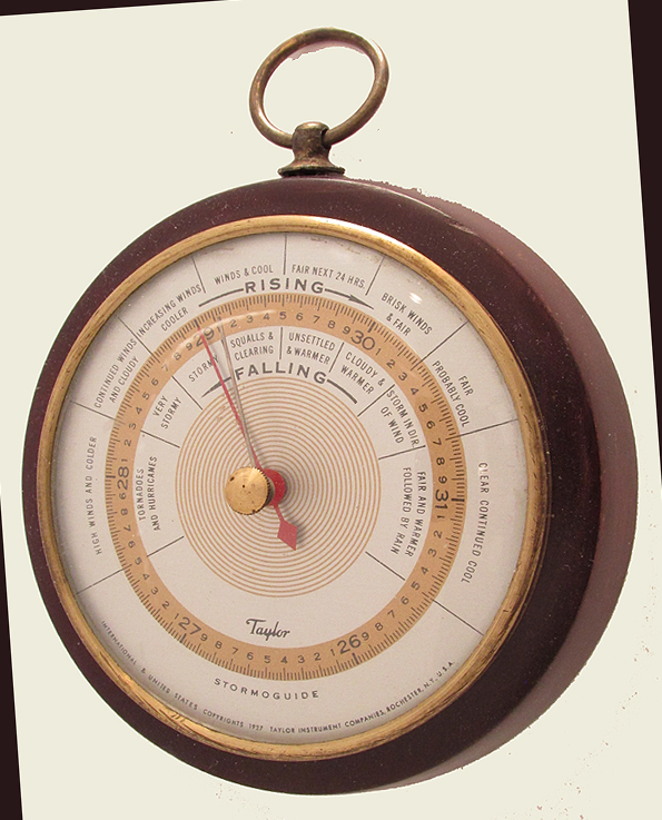 22.67 “STORMGUIDE.” Very interesting early 1900’s American aneroid barometer reading from 26 to 32 inches of atmospheric pressure in 2/100th increments marked by tenths. Two scales, “RISING” and “FALLING” predict varying weather conditions ranging from “Tornadoes and Hurricanes” to “Clear Continuing Cool.” A red indicator needle points to the reading and a gold set needle shows the previous reading. The dial is boldly signed “Taylor” above the instrument name “STORMGUIDE.” The very bottom of the dial reads “INTERNATIONAL AND UNITED STATES COPYRIGHTS 1927, TAYLOR INSTRUMENT COMPANIES, ROCHESTER, N.Y., U.S.A.” The dial is protected by a convex glass crystal, through which the set needle is rove. This precise instrument is mounted in its lovely solid hardwood body with brass suspension loop at the top for hanging. What is remarkable about this multi-functional instrument is that it can also be used for altitudes from sea level up to 3,500 feet! This function is accessible on the back as is the set screw for adjusting the reading. The instrument is 3 ¾ inches in diameter and the body is 5 7/8 inches wide. Excellent original condition in all respects. The barometer function is lively and accurate. A very handsome little weather instrument with an unusually wide range of readings. 239 |