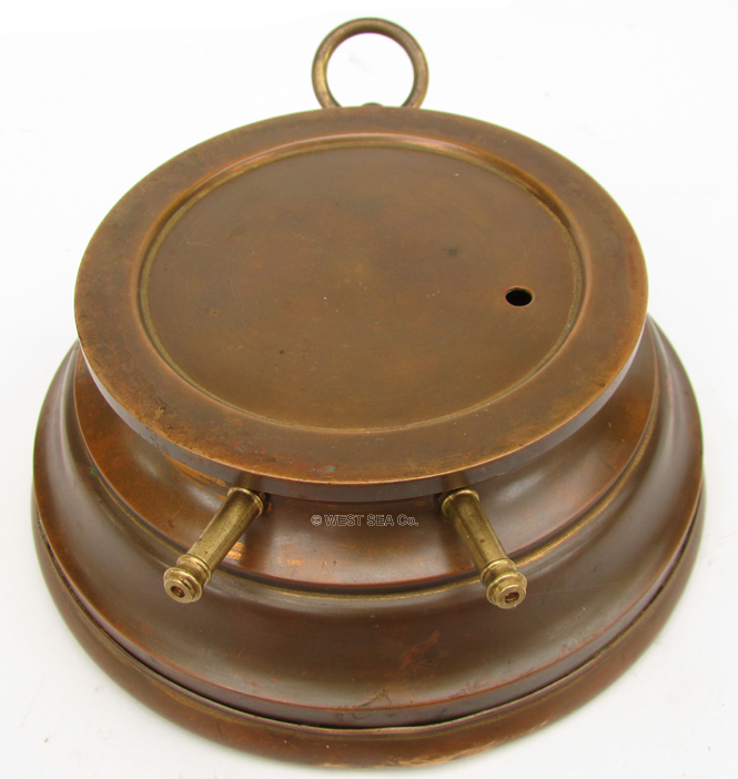 22.58 ESPECIALLY NICE BAROMETER. Early 1900’s German aneroid barometer made for the American market signed “The Standard Weather Bureau Service Co., Inc.” as marked on the dial. The bottom reads “Made In Germany” (pre-War). This particularly handsome barometer has an open face showcasing the complicated movement within. The dial is of porcelain colorfully marked with the standard weather notations in fancy script “Stormy, RAIN, Change, FAIR and Very Dry.” The atmospheric pressure is calibrated in inches of mercury from 27.5 to 31.5 in 2/100th increments marked by tenths. A delicate blued steel indicator needle points to the current reading overlaid by a brass set needle with knurled knob which records the previous reading. The dial is protected by its very thick beveled glass crystal set within a brass reflector ring. The case of the barometer is solid bronze. A significant aspect of this barometer’s extra appeal is the fact that it can be displayed in 2 ways. There is a pivoting suspension loop at the top for hanging. OR, it can be displayed on a desk or shelf supported on its 2 attached feet. The dial is 5 inches in diameter. The barometer body is 5 3/8 inches wide by 2 inches deep and stands 6 inches tall inclusive of the loop. Excellent original condition throughout. The barometer function is lively and accurate. This is a winner! 549 |