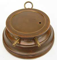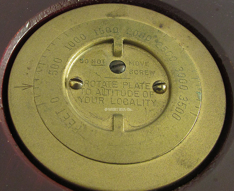 22.19 MOUNTAIN BAROMETER. Scarce early 1900’s American-made aneroid barometer for use at altitude. This lovely precision weather instrument has a white enameled brass dial protected by a glass face. The bottom of the dial is signed “Taylor Rochester, N.Y. U.S.A. / Toronto, Canada.” At the top it is marked “PAT. AUG. 18-1914.” The dial is calibrated in inches of mercury reading from 26 to 31 in tenths of inches, divided by 2/100ths. It is also marked with the standard weather indications “~STORMY – RAIN –CHANGE * FAIR – VERY DRY~.” A blackened steel indicator needle points to the precise reading, overlaid by a brass set needle connected to a knurled brass knob through the glass. The barometer is contained within its lovely solid bronze case with pivoting suspension loop at the top. The unique feature of this barometer is on the back. Rotating the knurled brass plate moves the entire movement within, thus setting the reading for a given altitude. The rim of the plate is calibrated in “FEET” of altitude from “3500 to 7000” in 100 foot increments. Instructions read “ROTATE THIS PLATE UNTIL ARROW ON CASE POINTS TO THE ALTITUDE OF YOUR LOCALITY. PATENTED AUGUST 18-1914.” 5 ¼ inches in diameter and 2 ½ inches deep. 6 ¼ inches tall overall including the suspension loop. This fine instrument is fully functional and in a virtually pristine state of original preservation. 349 |