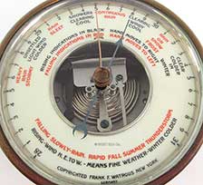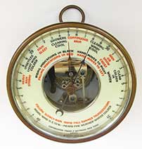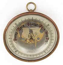 22.64 FORECASTING BAROMETER. Unusual very comprehensive early 1900’s American barometer with a colorful porcelain dial profusely inscribed with weather indications based on its reading coupled with user-observed winds. The outer periphery is calibrated in inches of mercury atmospheric pressure from 29 to 31 marked by tenths. This handsome open face barometer shows the complicated mechanism within. Above the center is the inscription “RISING INDICATIONS IN BLACK HAND MOVES TO THE RIGHT. FALLING INDICATIONS IN RED HAND MOVES TO THE LEFT.” On the periphery of the dial are numerous weather forecasts predicting precipitation, wind and temperature. The bottom of the dial is signed “COPYRIGHT FRANK F. WALTROUS NEW YORK.” This precision weather instrument has a blued steel indicator needle with a brass set needle attached to the knurled knob rove through the thick beveled glass crystal. The sculpted bronze body has a pivoting suspension loop at the top and 2 brass “feet” for upright display on a desk, bookshelf or cabinet. A small aperture on the back is provided for adjusting the reading. 4 ¾ inches in diameter and 2 inches thick. Outstanding original condition in all respects. The mechanism is lively and accurate. 349 |
