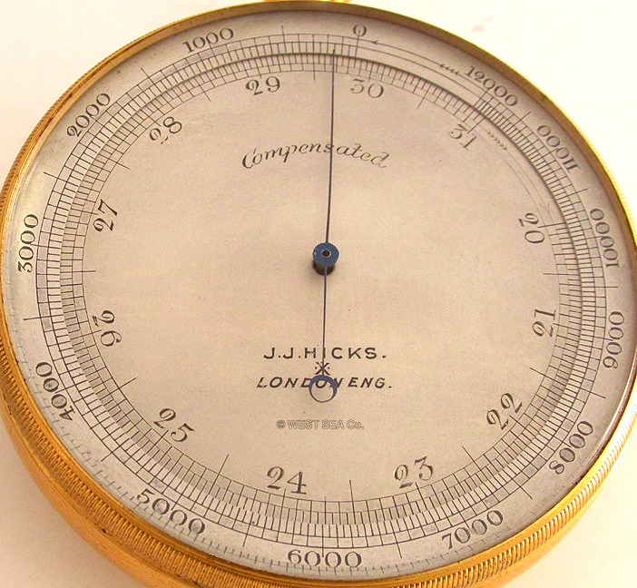 22.66 LARGE POCKET BAROMETER. Magnificent late 19th century gentleman’s pocket barometer made by the highly esteemed London maker James Hicks as beautifully engraved on the silvered dial “J. J. HICKS LONDON.” This wondrous example of precision instrument making in 19th century England consists of an aneroid barometer movement encased in a gilt brass housing with finely-engraved silvered brass dial. The dial reads from 20 to 31 inches of atmospheric pressure calibrated in 5/100th increments, marked in whole inches. Surrounding the dial is the altitude function which consists of a rotating ring marked in feet of elevation from 0 (sea level) to 10,000 feet calibrated in 50 foot increments. A very fine steel indicator needle about the width of a hair points to the reading. The dial is also marked “Compensated” which means the movement is adjusted for temperature changes. It comes complete with its original wooden case covered in rich Moroccan leather with white satin and purple velvet lining in excellent condition. The instrument is in perfect operational condition showing the slightest changes in atmospheric pressure relative to the atmosphere or altitude. 595 James Joseph Hicks (w. 1861-1900) was an optical, mathematical, and philosophical instrument maker located in London’s Hatton Garden. He was apprenticed to the renowned barometer maker L. P. Cassella. Hicks was known to have produced all types of barometers and enjoyed the patronage of the Vatican. (Edwin Banfield, “Barometer Makers and Retailers 1660-1900,” 1991, Baros Books, Trowbridge, Wiltshire, England). |