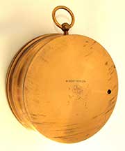 22.24 “MOUNTAIN” BAROMETER. Quite scarce early 1900’s American “Mountain Barometer” with the unique feature of being adjustable for altitude (elevation). This precision instrument was made by the Tycos Company of Rochester, N.Y. as signed on the bottom of the white enameled dial. The dial is calibrated for atmospheric pressure in inches of mercury spanning the wide range from 25 to 31 inches in 2/100th increments marked by 10’s. It bears the standard weather indications “@STORMY @ RAIN, CHANGE * FAIR @ VERY DRY @” with the added notations “LOW & HIGH.” At the top it is marked “PAT. AUG.-18-1914.” The reading is indicated by a fine blued steel needle overlaid by a brass “set needle” with knurled brass knob rove through the beveled glass cover. The body of this instrument is solid bronze in its original flawless golden lacquer finish. The back of this instrument bears the rare patented feature which allows it to be adjustable. It consists of a knurled disc calibrated in feet of elevation from 0 to 3,500. The engraved instructions read, “FOR A SEA LEVEL READING ROTATE THIS PLATE UNTIL THE ARROW ON THE CASE POINTS TO THE ALTITUDE OF YOUR LOCALITY.” The back also has an aperture for a set screw to further adjust the movement. The top is equipped with a pivoting brass loop for hanging. 5 ¼ inches in diameter and 6 inches high overall. Absolutely perfect condition is all respects. The precise mechanism is lively and accurate. The best! 395 |