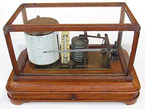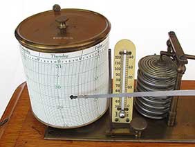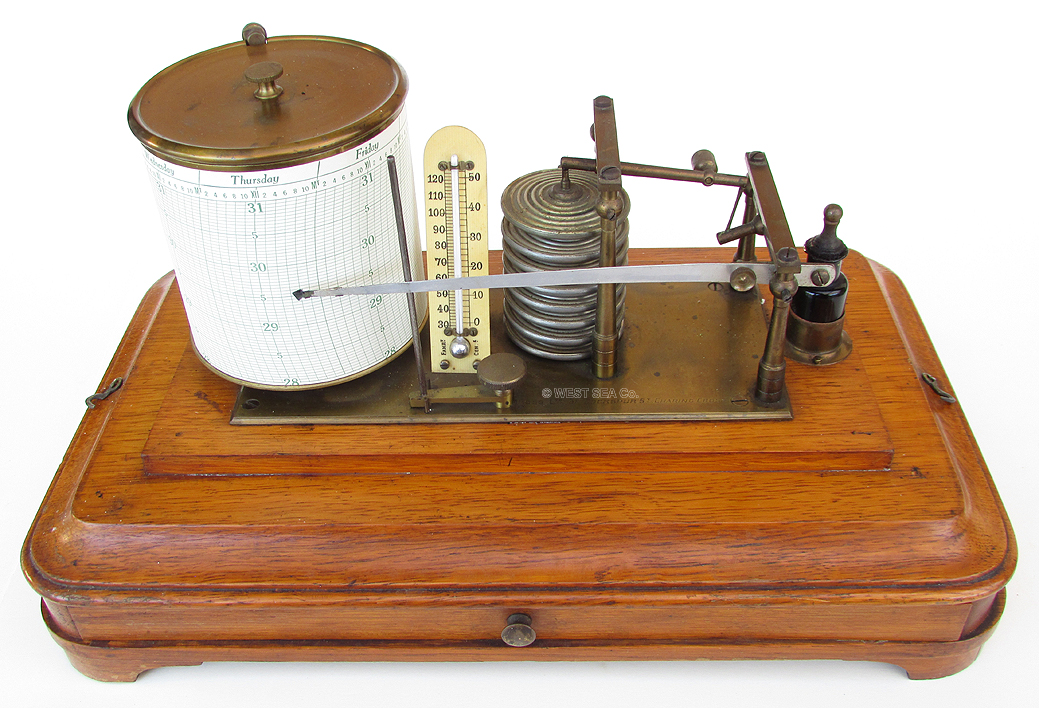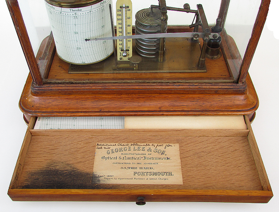 22.40 BAROGRAPH. Superb quality, third quarter 19th century British recording barometer by one of the most famous makers of the era, “LENNIE EDINBURGH” as engraved on the bedplate. This precision scientific instrument is as lovely as it is accurate. The complex solid brass mechanism is gold washed. It consists of a stack of 8 flexible aneroid bellows attached to a linkage which transfers motion to an inking stylus at the end of a long metal trace. The bellows expand and contract with changes in atmospheric pressure, the extent of which are measured on the revolving clockwork drum. To set the reading a knurled thumbscrew is at the top of the cross bar of the support columns. A long arm attached to a knurled knob on the bedplate allows the trace to be disconnected from the drum when not in use. The drum is encompassed by an interchangeable paper chart calibrated in barometric inches of mercury from 28 to 31 in 5/100th increments on the a axis. The x axis is calibrated in days of the week divided by 2 hour intervals. The bottom of the chart is signed “LENNINE 40 PRINCESS STREET EDINB.” Inside the drum a jeweled clockwork with built-in winding key revolves the drum precisely once a week to produce a continuous and accurate record of atmospheric changes. These observations were important for the British Meteorological Office (the “Met” formed in 1854) to help forecast weather at sea for the safety of seamen. To these ends a large number of blank and actual inked charts are contained in a drawer below. The mechanism is housed in a handsome splined solid mahogany case with thick beveled glass on all 5 sides. An articulated brass arm allows the case to be opened and held in place while servicing. A small bottle of special red recording ink is held in its receptacle. The entire unit measures 14 ½ inches long by 9 inches wide and 8 3/8 inches tall. Outstanding original condition. The clockwork has just been fully serviced by a professional watchmaker. 1495 |