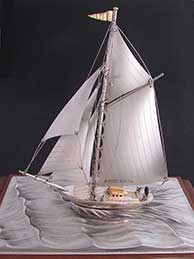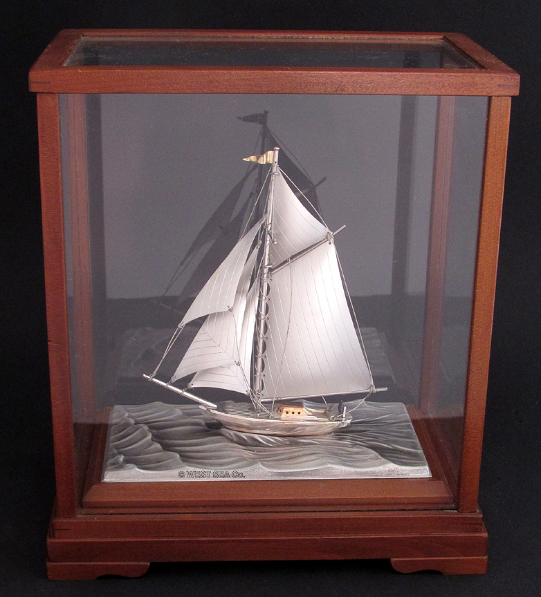 2.96 SILVER MODEL. Delightful, cased model of a gaff-rigged ketch under full sail plying a wavy sea. The model has all 5 sails set and is flying a pennant from the mast. The mains’l shows mast hoops properly rigged. The solid silver hull shows simulated planking surrounding the cabin and cockpit. The helm is realistically portrayed with a classic ship’s wheel. The hull is marked “STERLING 960.” The entire presentation is housed under 5 panels of clear glass within a handsome rich hardwood frame of pinned construction, The case measures 9 1/8 inches high by 5 inches wide and 8 inches long.. Superb original condition. WAS $895 NOW 295 |