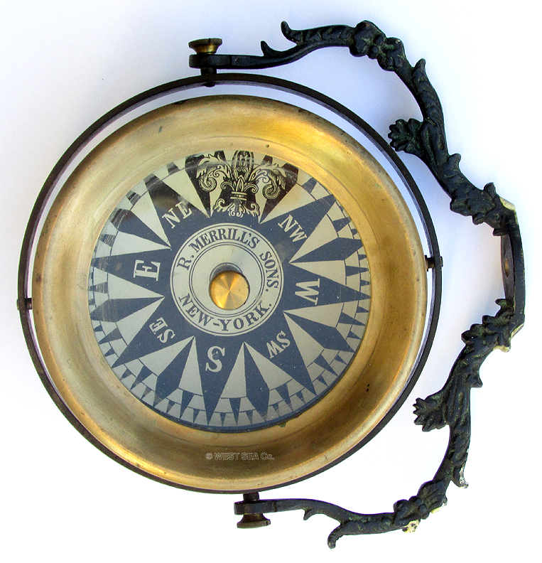3.62 TELLTALE COMPASS. Third quarter of the 19th century American magnetic compass known as a “telltale” because it allowed the Captain’s to monitor the course steered by the ship’s helmsman. Also known as an “upside down” compass, this arrangement was designed to be hung from the overhead in the Captain’ cabin observable while seated at his desk or his bunk. This pristine example has an engraved paper card back by mica, It is boldly marked with the points of the compass rose down to ½ points and is marked by the Cardinal and Intercardinal points. The north point is designated by a very elaborate fleur-de-lis. The center is signed by the Maker “R. MERRILL’S SONS, NEW-YORK.” The card is supported on a jeweled pivot which is rove through the glass face. It is encompassed by a flared brass flange set into the circular compass body supported in gimbals. Of particular note and value this compass is complete with its original ornate hanging bracket with a decorative floral design. The diminutive compass flange is 5 ½ inches in diameter and 3 5/8 inches in height. With its suspension bracket it is 8 inches wide and stands 6 3/4 inches high when mounted to the overhead. Outstanding original condition in all respects. Fully functional with no flaws. Just about 150 years old. This example is a gem! 1495 |