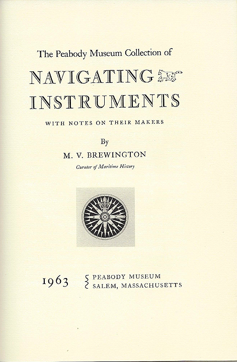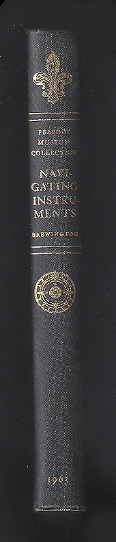 7.39 REFERENCE BOOK. M.V. Brewington, “The Peabody Museum Collection of Navigating Instruments,” 1963, The Peabody Museum, Salem , Massachusetts. First edition. 145 pages exclusive of index, hard cloth cover, profusely illustrated with black and white photos. Long regarded as the ‘American Bible of Navigational Instruments,’ this landmark work contains detailed information on “Instruments For Location From The Heavens, Instruments of Direction, Instruments of Time, Speed and Distance,” and “Miscellaneous Instruments” such as Dead Reckoning Recorders, Graphic Tools, Sounders, Telescopes, Tide Calculators, Manual Computers, Barometers, Thermometers, Orreries, etc.” A large section is devoted to photographs of representative instruments in the museum’s collection and their detailed descriptions. Further, an extensive portion of the book contains the detailed biographies of early instrument makers, dealers and designers. Initially printed in a limited quantity, this wealth of information was selling for up to $500 in the early days of its publication! It was reprinted in the 1990’s by an authorized outside publisher, selling for $150 a copy. This is a prized ORIGINAL 1st edition! MINT, as new condition. 99 |