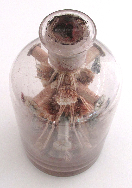 16.46 P.O.W. BOTTLE WHIMSEY. Extraordinarily rare bottle folk art as produced by French Prisoners in British prisons during the Napoleonic Wars 1795 – 1805. This amazing example is contained in a clear hand-blown glass bottle with telling pontil on its thick base. It contains a very complex wooden structure comprised of 12 radiating arms in 3 tiers. Each of the arms is tightly decorated in wrapped silk thread providing a shimmering appearance. At the end of each arm is a multi-faceted radiating silk disc. What’s more, every arm supports suspended silk tassels on their ends. Further complicating the display, there are radiating silk sprays at the juncture of each of the arms. But if that wasn’t enough to showcase the maker’s skills, he embellished the bottom of the bottle with a fabulous array of woven silk segments radiating from the center in a variety of contrasting colors. (Please see the photo). The undisturbed original cork stopper is in place under the original sealing wax. The neck contains an “mystery” comma-shaped cross brace with suspended brass “tear drips.” The bottle measures 6 ¾ inches tall and 3 ¼ inches in diameter. The bottle and its contents are in exceptional original condition after more than two and one quarter centuries! Without question museum-quality. Offered here at an absolutely bargain price. Easily a $1,500 value. NOW 495 |
